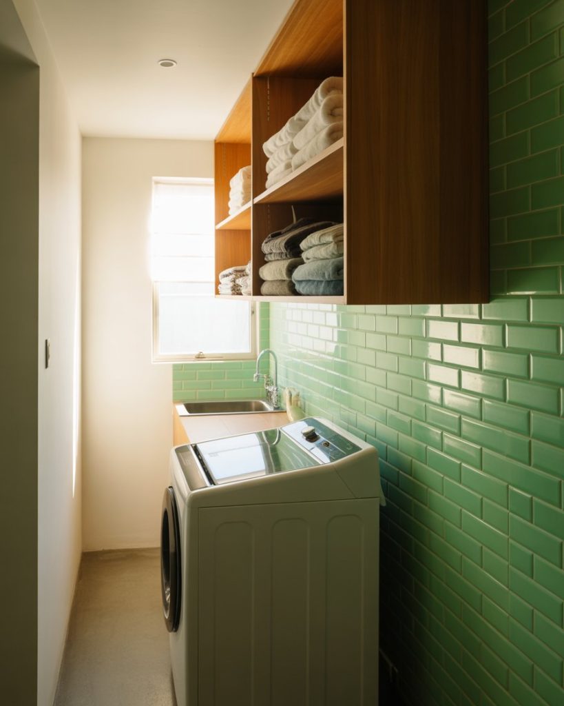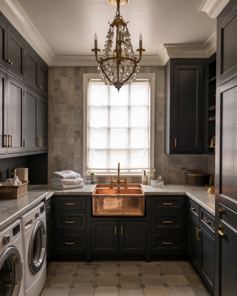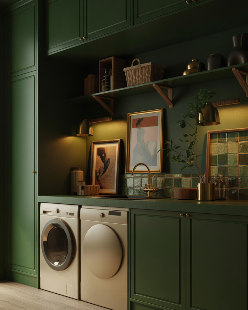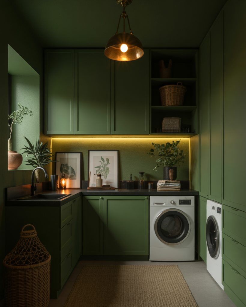 Forget all-white laundry rooms—embrace dark, colorful, or moody palettes that express personality. Deep navy, forest green, or terracotta walls can transform your space into an artistic retreat. A touch of warm lighting or art makes even laundry day inspiring.