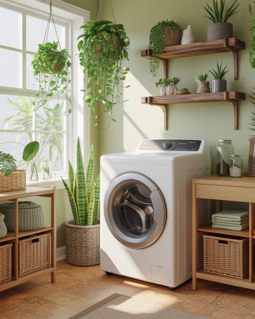 An eco-conscious laundry space is all about sustainability. Opt for energy-efficient machines like a top load washer, organic materials, and DIY detergent storage jars. Even a tiny laundry nook can feel meaningful when it helps the planet.