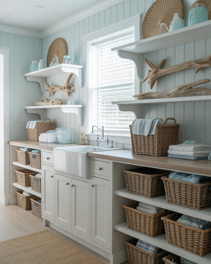 Bring seaside serenity into your home with a coastal-inspired laundry room. Use soft blues, sandy neutrals, and driftwood finishes. A small narrow room can shine when paired with woven baskets and ocean-themed art for a breezy touch.
