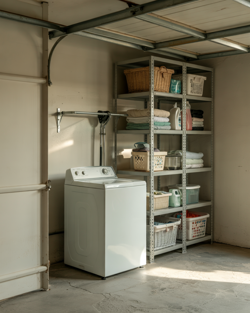 If you’re short on interior space, transform your garage corner into a functional laundry zone. A top loader layout works best here, surrounded by sturdy shelving and metal bins for organization. Durable materials keep it both tough and tidy.