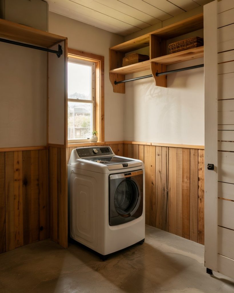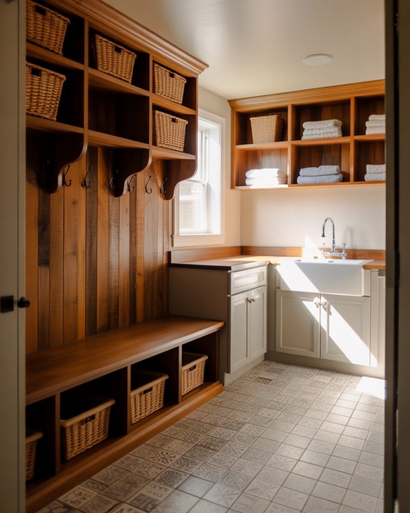 Combining your mudroom and laundry setup creates a perfect transition zone from outdoors to indoors. It’s ideal for rinsing muddy boots or washing pet gear. Choose rustic wood accents, built-in benches, and easy-to-clean tiles to balance practicality with charm.