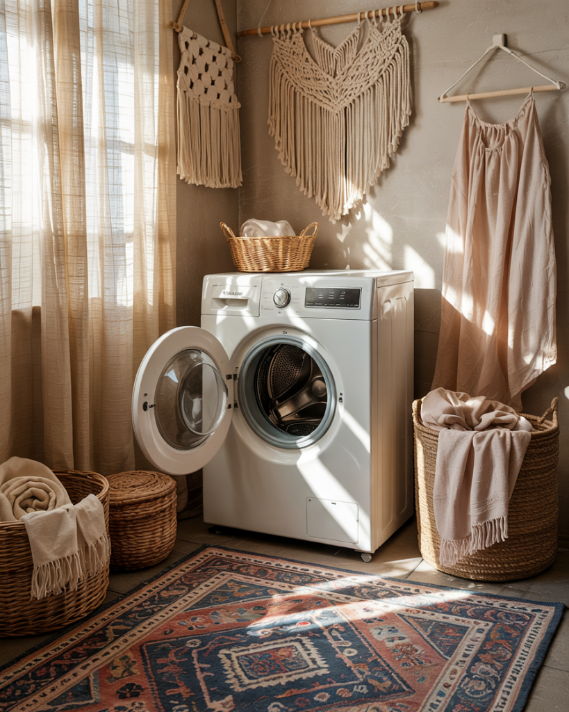 For free spirits, the DIY-inspired boho laundry blends pattern and personality. Use woven baskets, layered rugs, and macramé decor to soften the space. A tiny corner with texture and warmth can make laundry feel like self-care time.