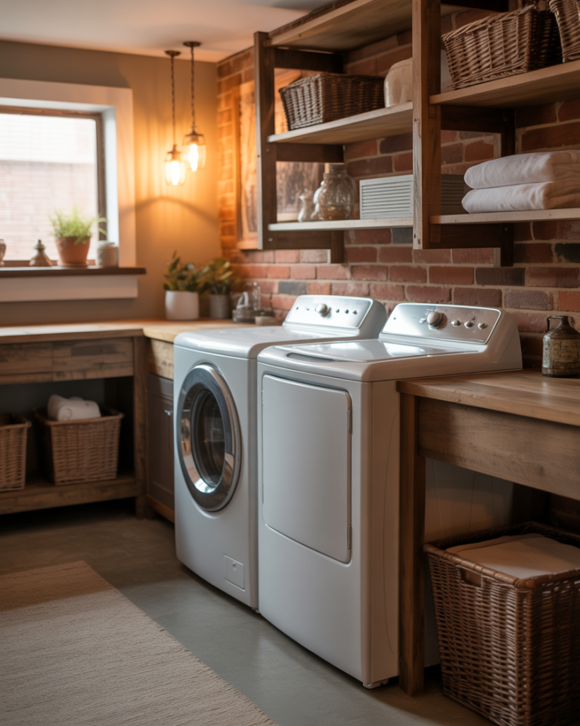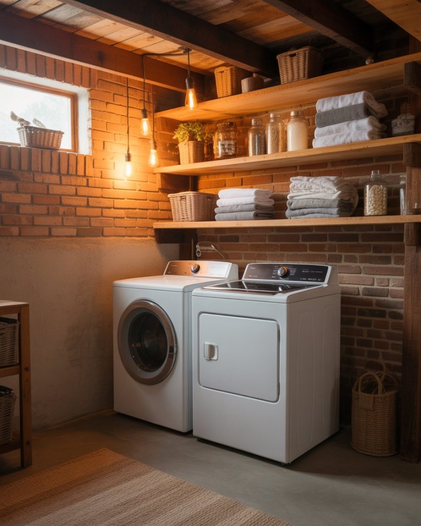Transforming your basement into a cozy laundry space is easier than you think. Use moisture-resistant flooring, layered lighting, and warm tones to avoid the typical dark feel. A top load washer or stacked washer dryer fits perfectly here, paired with rustic finishes that make the space feel homey.