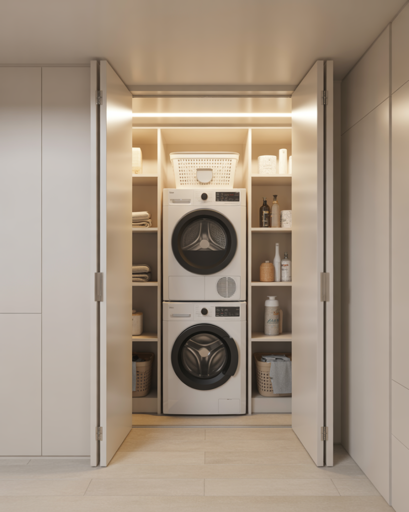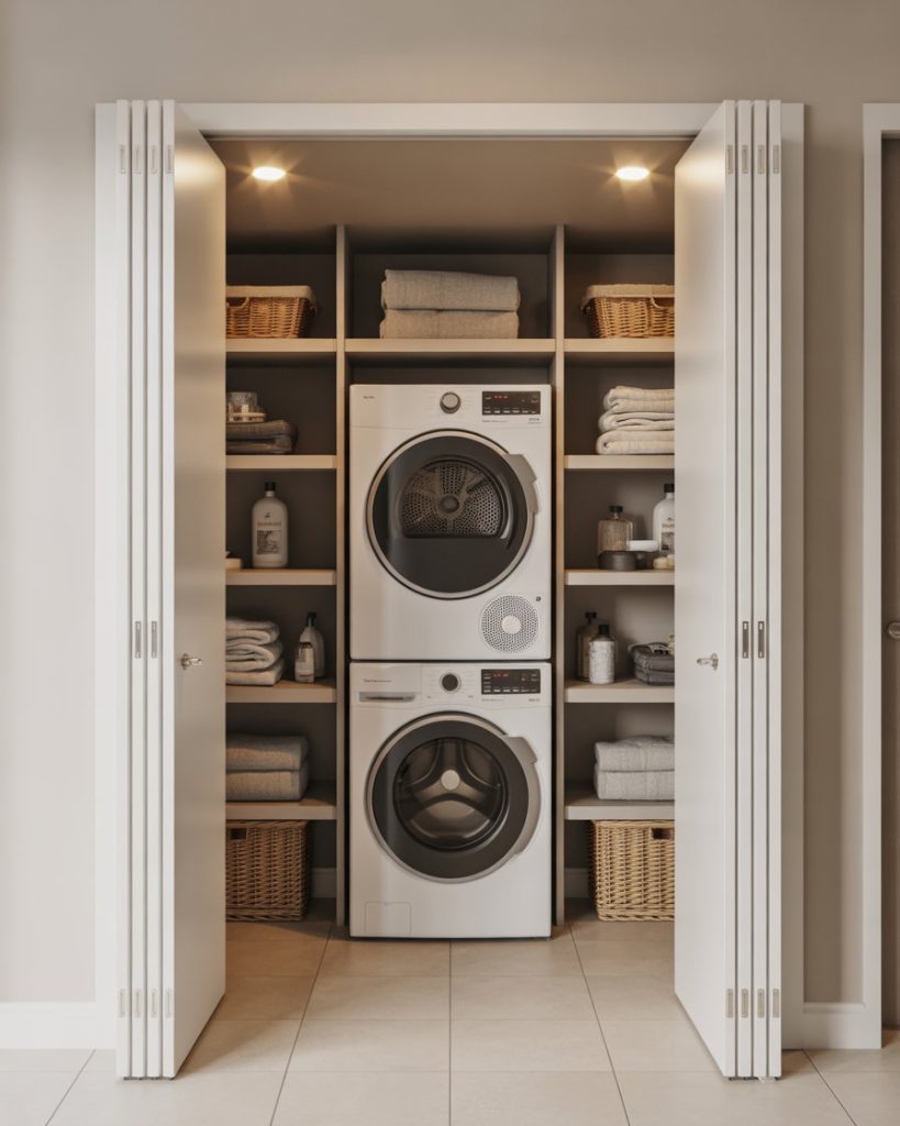 A hidden closet laundry area is the secret weapon of organization lovers. Behind folding doors, a stacked washer dryer or small space stackable setup turns an unused corner into an efficient cleaning hub. Add woven baskets, a folding shelf, and bright lighting for effortless style.