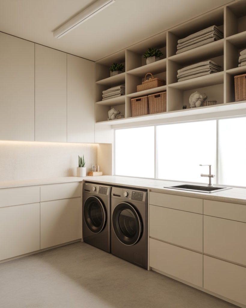 For narrow or small narrow laundry spaces, vertical storage is key. Use wall-mounted drying racks, upper cabinets, and a top loader layout that maximizes comfort. Glossy backsplashes or mirrors expand the space visually, giving even a tight room a refreshing feel.