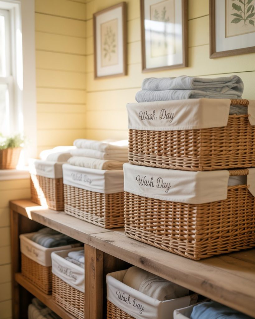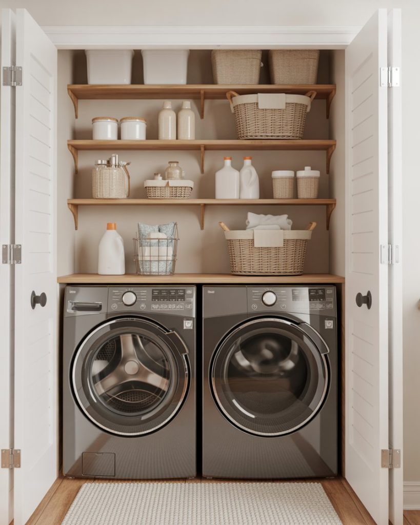 For those who love a farmhouse vibe, woven baskets are the ultimate storage solution. They’re practical for sorting clothes, towels, or products, while also lending a warm, rustic charm. Combine them with wooden shelves cabinets storage ideas or distressed finishes for a cozy look. Even in a tiny laundry area, farmhouse details create a welcoming, homelike atmosphere while keeping clutter under control.