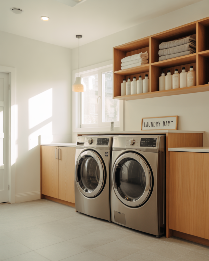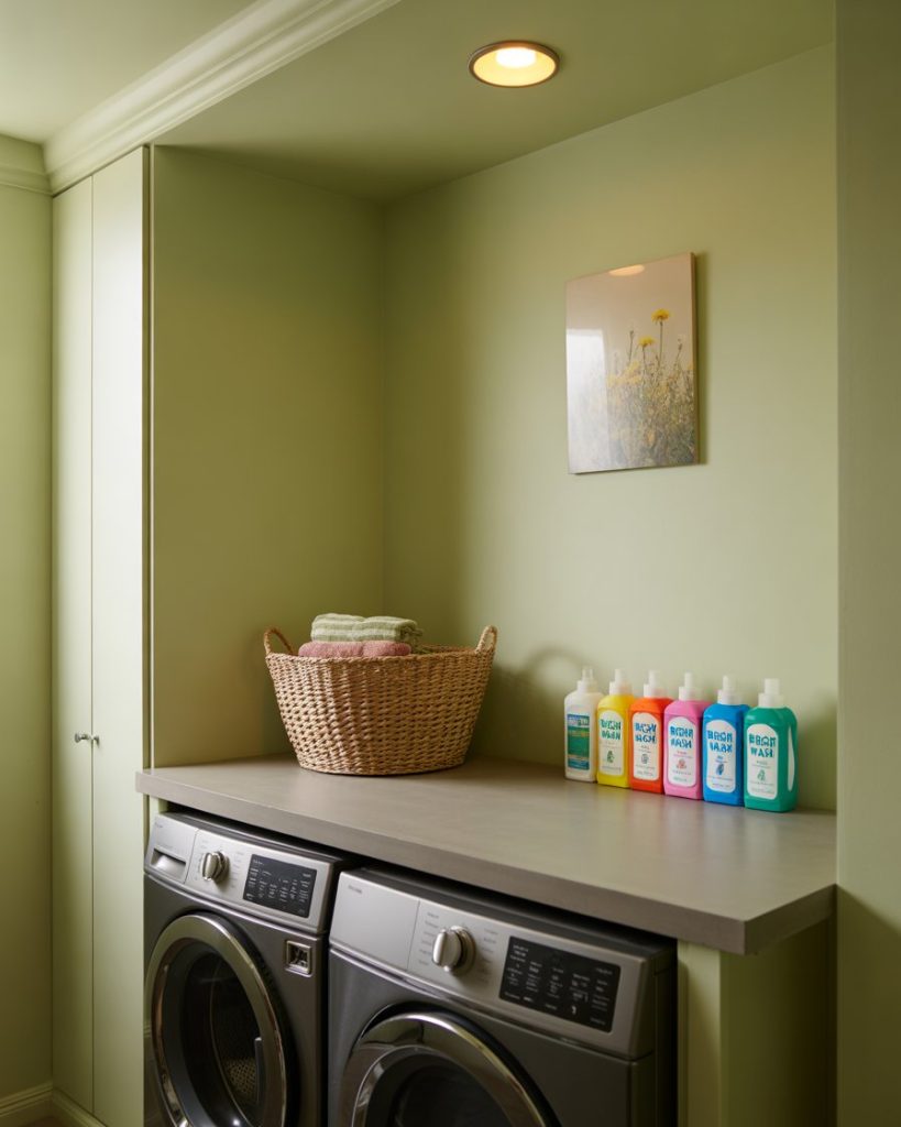 If you’re short on space, creating a folding station over your washer or top loader is one of the smartest ideas storage fans love. A simple countertop or diy wooden plank gives you room to fold laundry or hold products. It’s ideal for apartments or basement laundry rooms where floor space is at a premium.