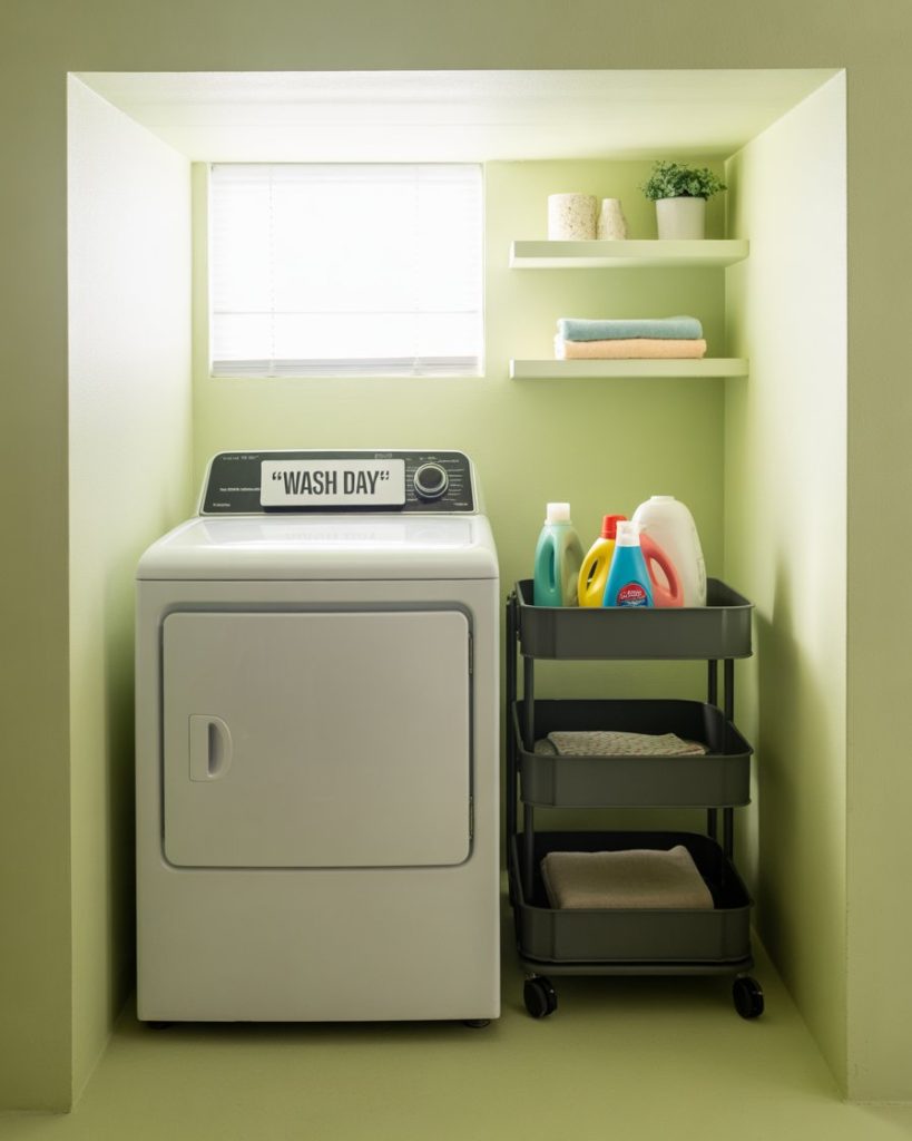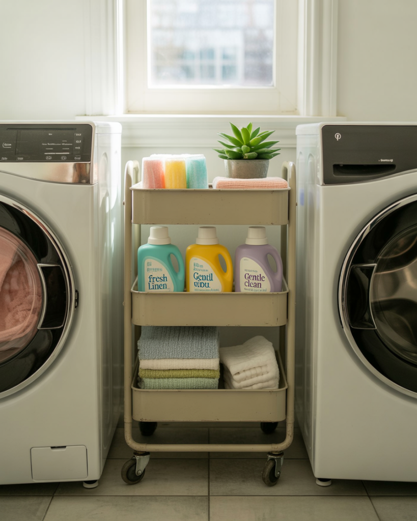 A slim rolling cart fits neatly between a stacked washer or side-by-side units, providing extra storage for detergent, bleach, and cleaning products. This hack is perfect for tiny nooks or apartment setups where cabinets won’t fit. It’s one of the simplest and most budget-friendly tips to maximize every inch.