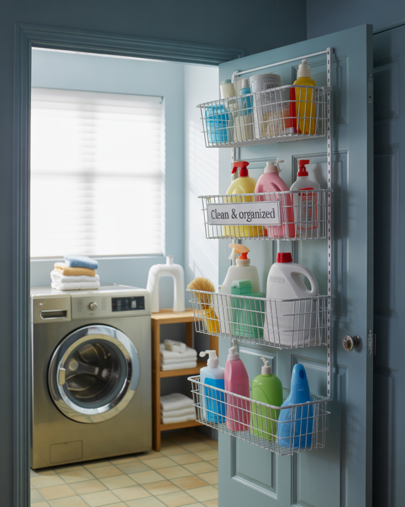 When floor and wall storage are maxed out, over-the-door organizers can make a huge difference. These products hold brushes, stain removers, or even baskets in closet-style laundry rooms. They’re ideal top loader storage ideas because they don’t block access to the machine and keep clutter out of sight.