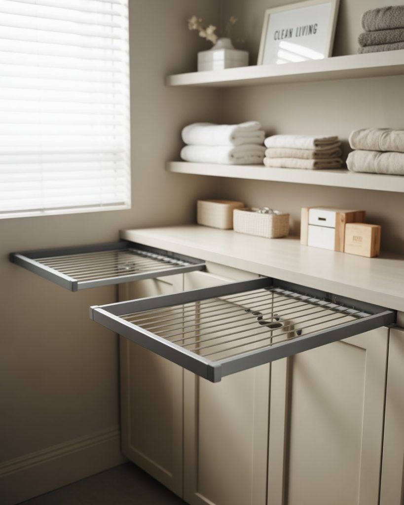 Pull-out drying racks hidden in cabinets or mounted under shelves are lifesavers in tiny or apartment laundry rooms. They provide space for delicates without taking up floor area. This diy solution feels custom-made and blends well with both modern and farmhouse styles.