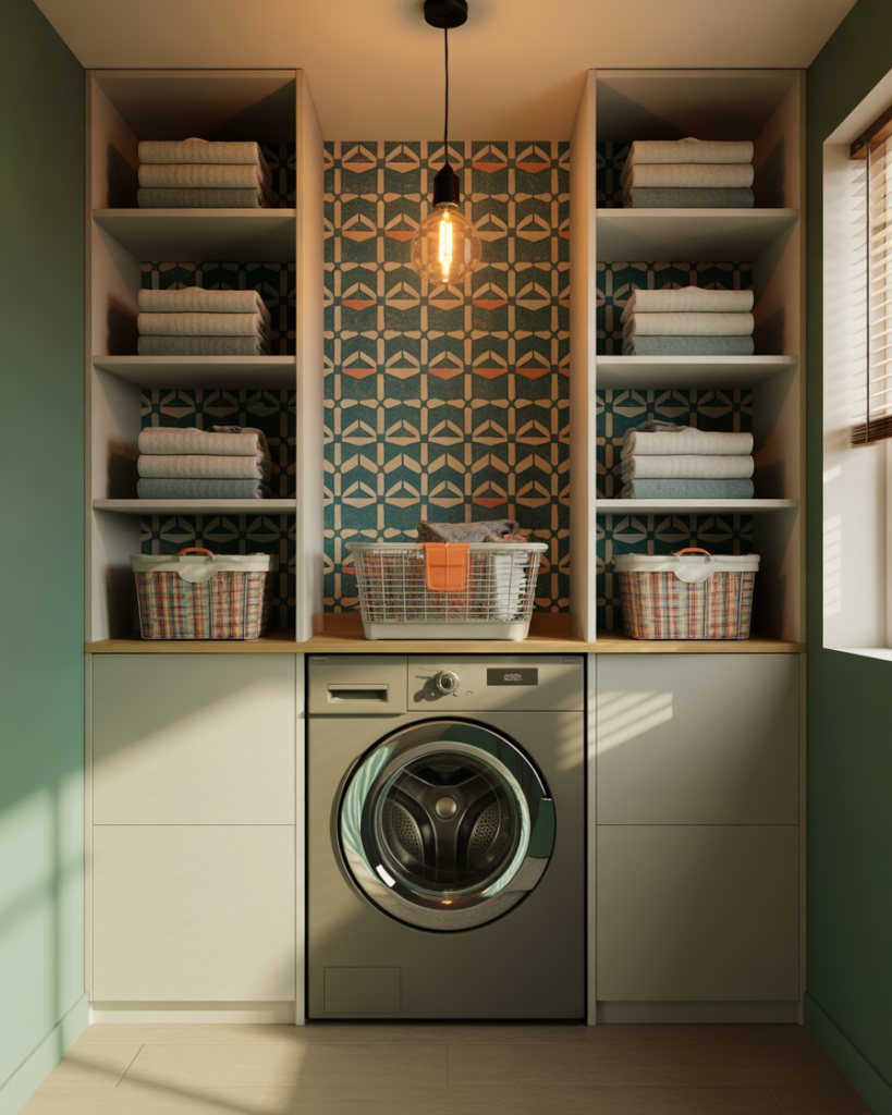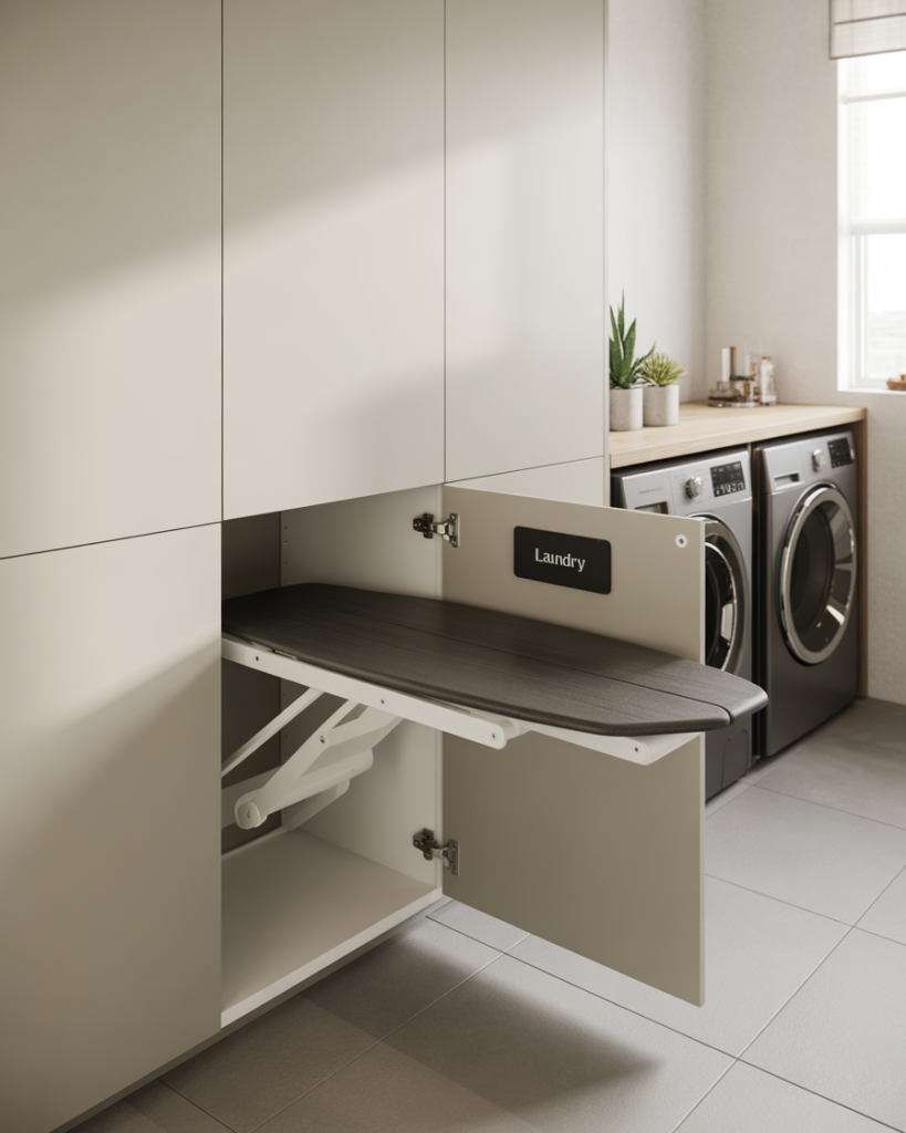 A fold-down ironing board built into a cabinet is a classic space saver. Instead of wrestling with a bulky board, this design hides away neatly when not in use. It works beautifully in basement laundry rooms or closet-based setups, adding both aesthetic charm and practical convenience.