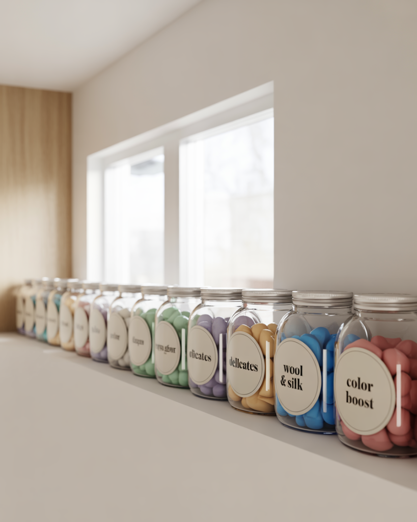Transferring detergent and other products into glass or ceramic jars is a simple way to upgrade your laundry aesthetic. Labeled jars look beautiful on shelves or cabinets and prevent bulky packaging from cluttering your small space. This diy project is inexpensive yet impactful.