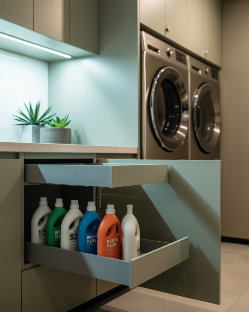 A cabinet with pull-out shelves brings order to any laundry setup. Unlike traditional cabinets, these let you store products like bleach or softener deep inside without losing them in the back. In tiny laundry rooms or even a closet setup, they provide seamless access. It’s a practical solution that feels like custom design—great for fans of diy upgrades or anyone craving high-function shelves cabinets storage ideas.