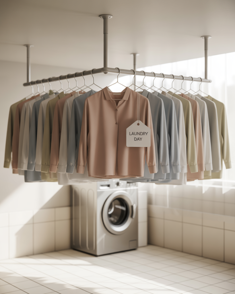 For small spaces where floor racks won’t fit, ceiling-mounted rods are excellent ideas storage. They hold hangers for drying shirts or keeping clothes wrinkle-free after the stacked washer dryer. This is a clever diy solution often used in apartment laundry rooms with tiny layouts.
