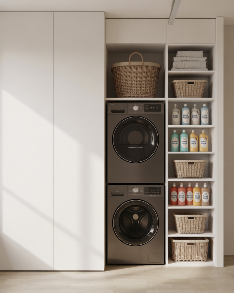 When floor space is limited, a stacked washer dryer becomes a game-changer. Perfect for apartment living or tiny laundry nooks, this layout frees up valuable room for shelves or a built-in laundry hamper. Add a slim cabinet alongside for vertical storage and you’ll have a tidy, functional corner. Many interior designers recommend this setup as one of the best top loader storage ideas when square footage is tight.