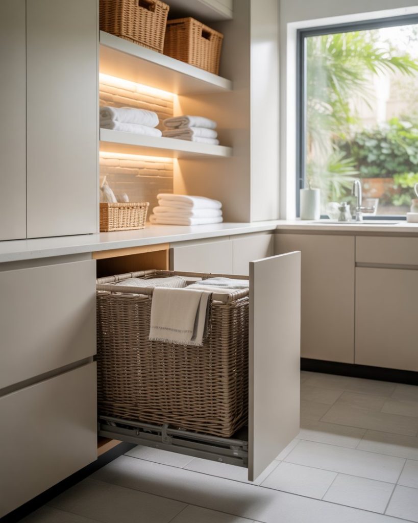 A built-in laundry hamper saves you from the constant shuffle of clothes baskets. Whether you hide it in a closet or integrate it into your cabinets, it’s a sleek way to manage dirty laundry. In a basement laundry room, this can double as an organizational hub, while in a small space it eliminates the need for bulky, moveable hampers. It’s one of those diy upgrades that adds real convenience and elevates your daily routine.