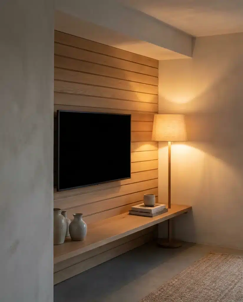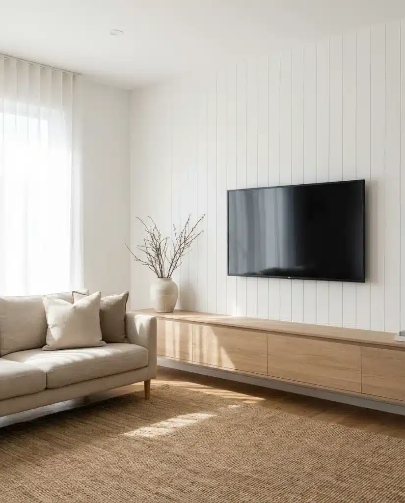 The minimalist slat panel media wall is one of the top-performing ideas with TV on Pinterest right now, and it’s easy to see why. Clean vertical or horizontal slats in natural wood tones or painted white create an architectural backdrop for the television that elevates the whole wall without overwhelming it. Unlike a gallery wall or wallpaper, the slat panel keeps the eye moving and creates a rhythm that works beautifully with the rectangular geometry of a flat screen. It’s modern, restrained, and suits everything from Scandinavian-inspired minimalism to contemporary transitional living rooms.