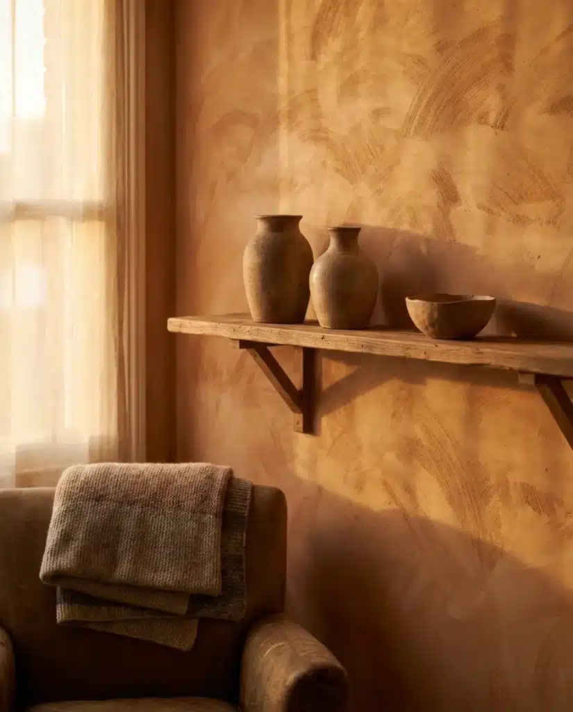 The limewash trend has officially moved from boutique hotels into everyday American homes, and it looks stunning on a single living room wall. This technique creates soft, layered depth—never flat, never predictable—and the warm terracotta palette feels grounded yet modern. It pairs beautifully with linen couch upholstery and natural wood furniture, making the wall feel like it has genuine character rather than just a coat of paint. It’s the kind of wall that people walk into a room and immediately say, “What is that?” I love it.”