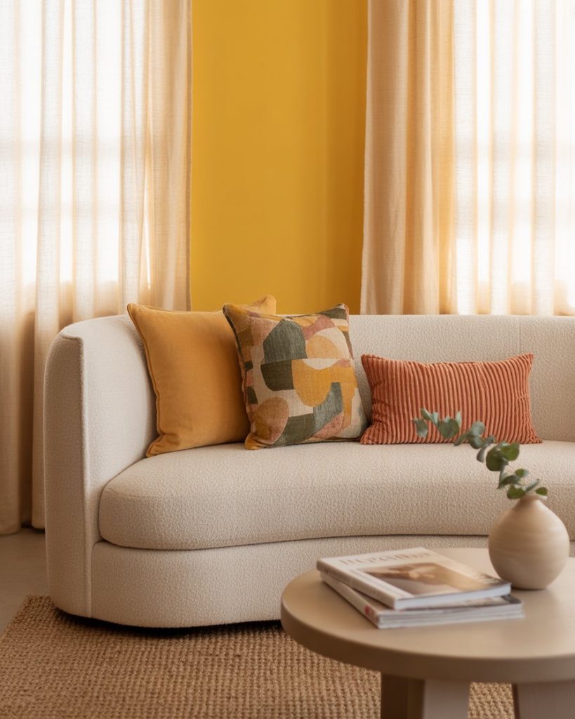 A sunny yellow accent wall injects cheerful personality into the living room. Paired with light brown wood floors, this color feels bright, uplifting, and perfect for family-centered spaces. Designers often suggest pairing yellow with neutral furnishings to avoid overwhelming the eye. This palette also plays well with boho decor, adding vibrancy to woven textures or greenery.