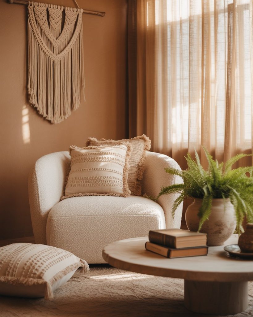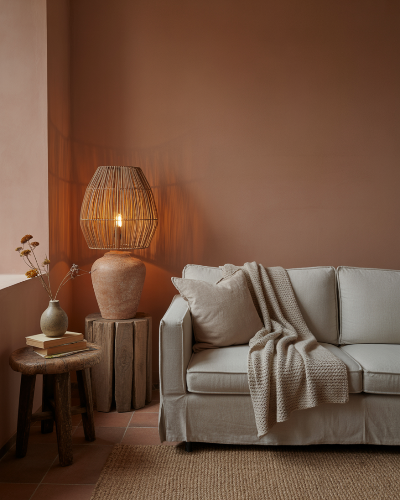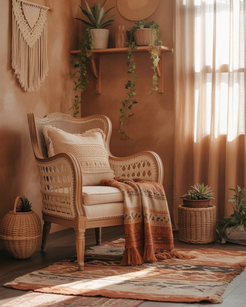 Combining boho influences with rustic design creates a playful, layered look. Think muted clay paint with pops of bright patterned textiles, woven baskets, and plants. A muted terracotta backdrop highlights accent wall small spaces cozy corners, giving personality without overwhelm. Designers like Justina Blakeney champion this marriage of earthy grounding and eclectic freedom.