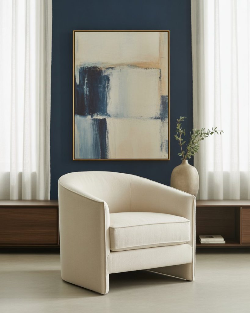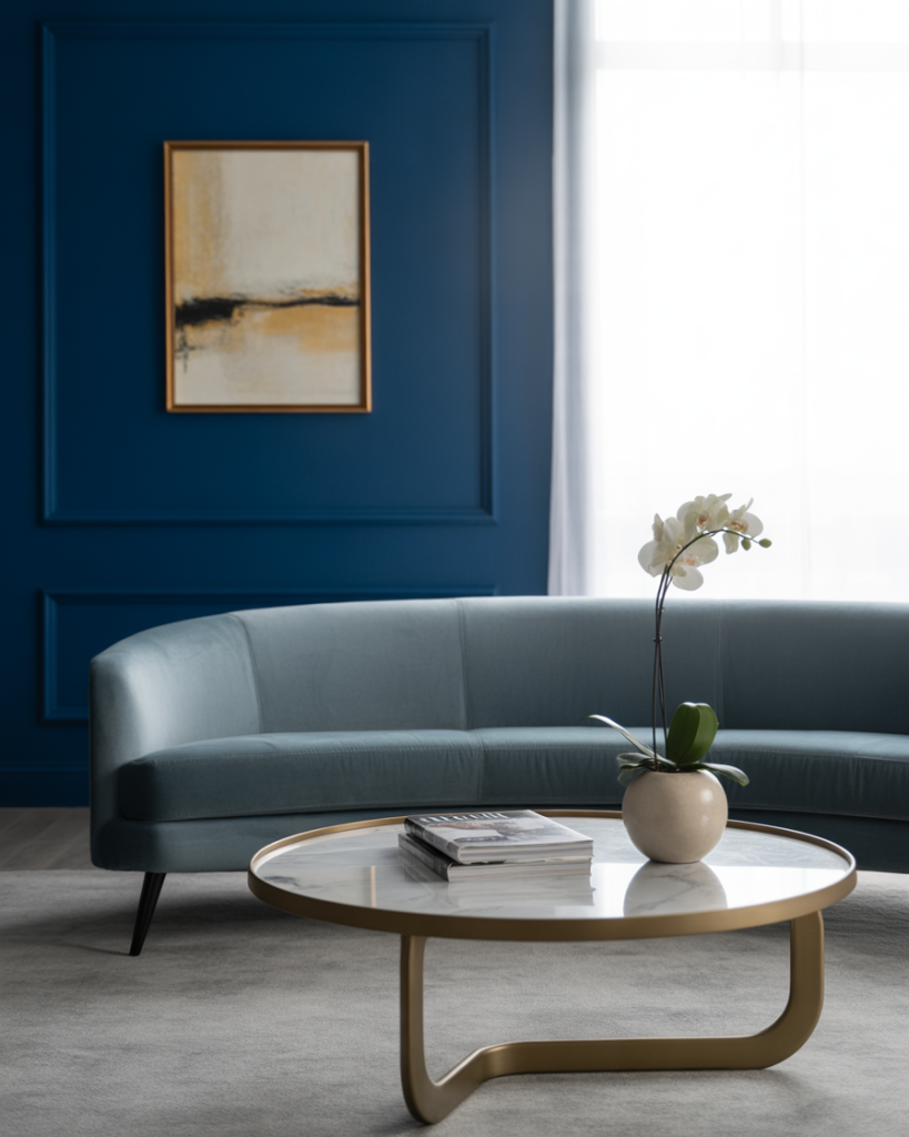 A navy accent wall adds instant depth and looks striking with grey accent wall gray flooring or light brown wood floors. Navy pairs well with modern gold accents or even rustic wooden shelving. It’s bold yet versatile, making it a favorite for homeowners who want something dramatic without going all the way to black. Behr highlights navy as a top 2025 trend color.