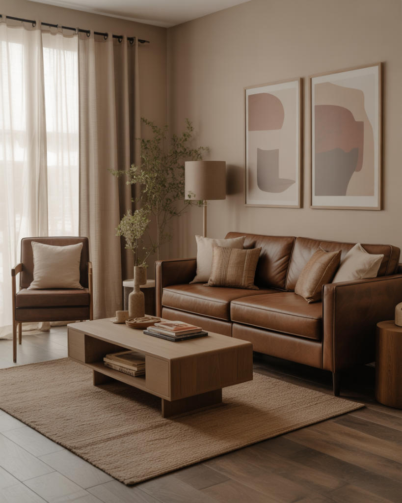 Sometimes, nothing beats a classic. Crisp white walls set a neutral foundation, making brown furniture the star. This look is simple, bright, and adaptable to modern, rustic, or even boho themes. Design experts like Nate Berkus emphasize how white walls allow art, rugs, or accent décor to shine without distraction. It’s also the easiest way to refresh a room on a budget.