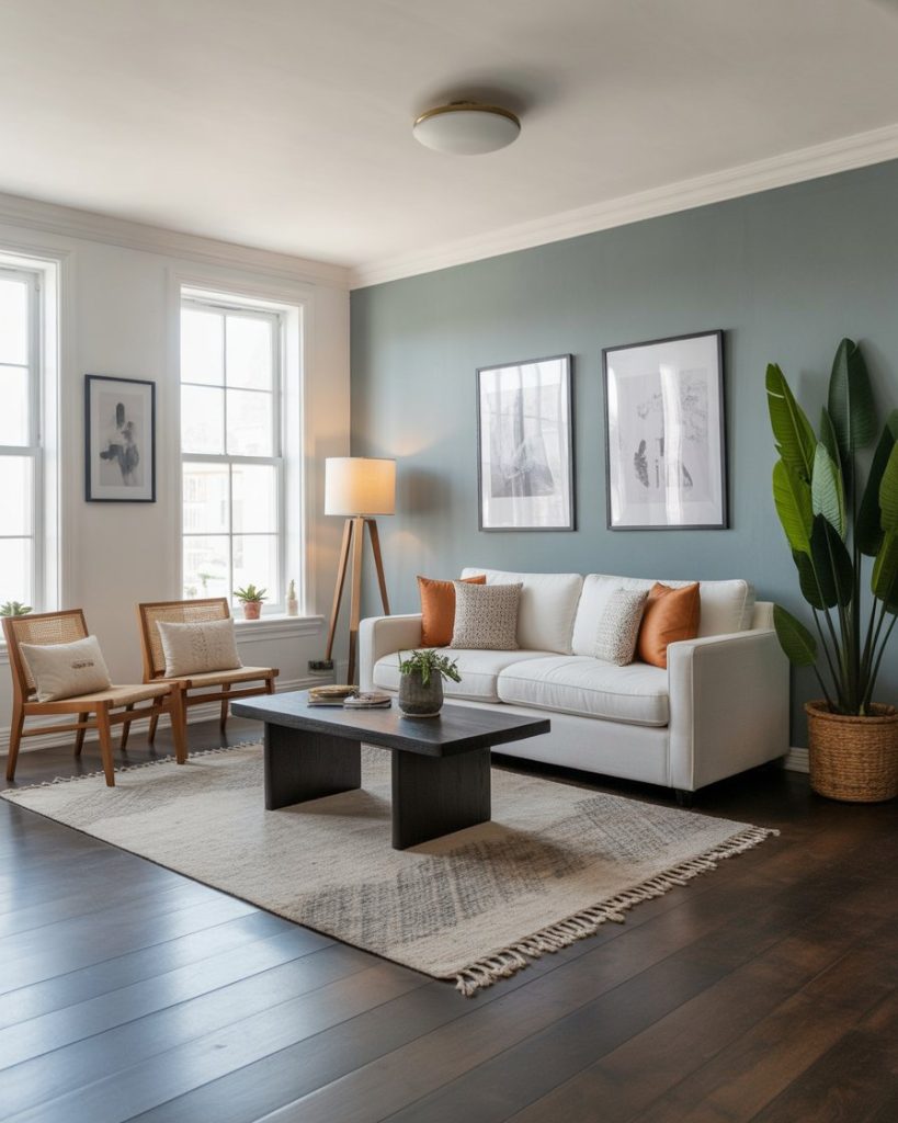 An accent wall light blue introduces a refreshing softness to the living room. This shade reflects sky-like serenity and pairs beautifully with dark wood floor finishes. According to Houzz contributors, light blue is a versatile backdrop for boho or modern themes alike. It can make small spaces cozy, while still offering that bright open-air feel. Pair with white or beige furnishings for balance.