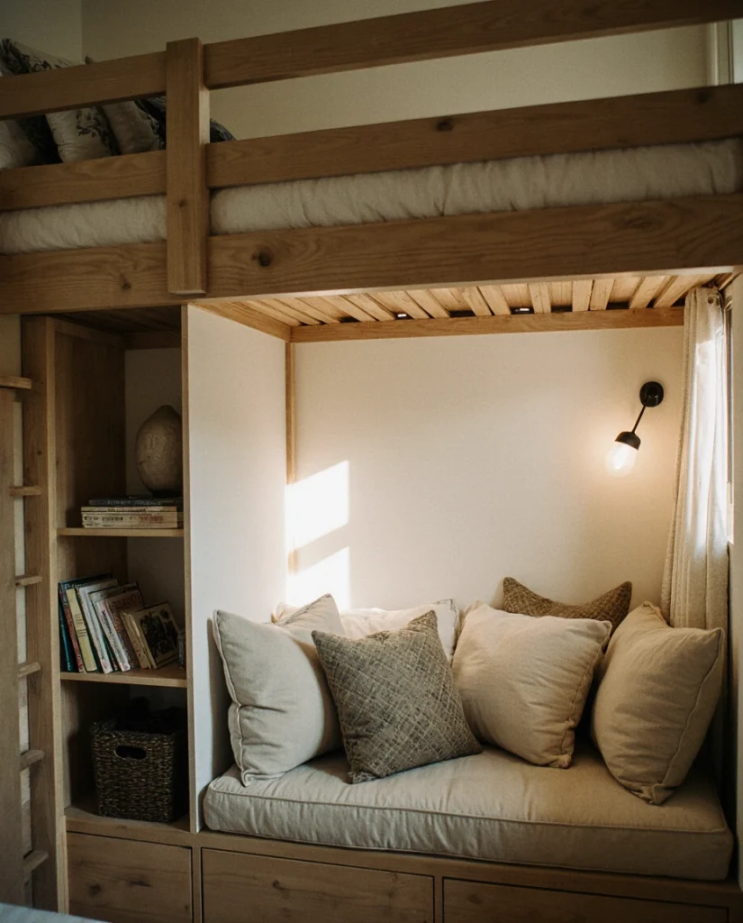 Transform the space beneath a loft bed into a dedicated cozy reading retreat by incorporating soft lighting, plush seating, and book storage that turns an overlooked area into your favorite corner of the house. This setup works beautifully in small rooms where a traditional reading chair wouldn’t fit, using the vertical clearance to create an intimate, cave-like atmosphere perfect for getting lost in novels. Add a small upholstered bench or floor cushions, a swing-arm reading lamp, and floating shelves for your current reading stack.