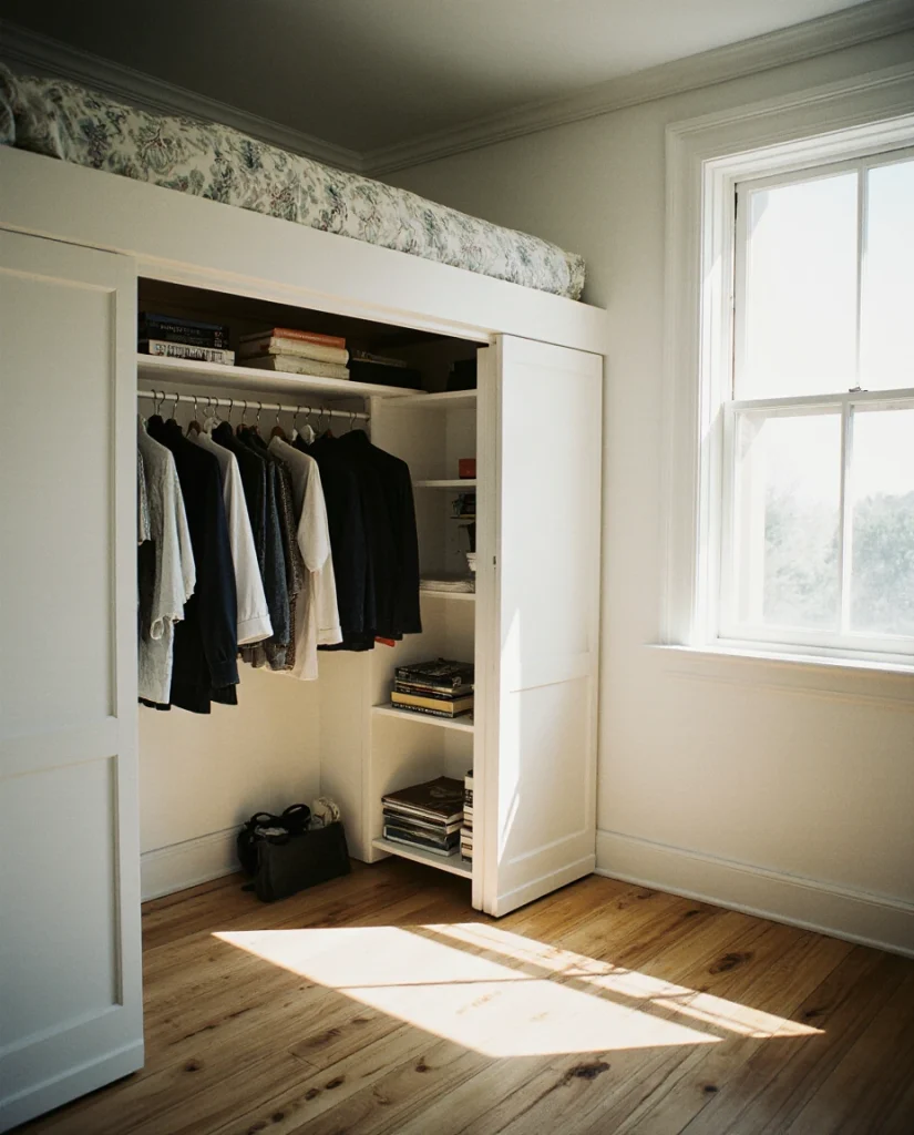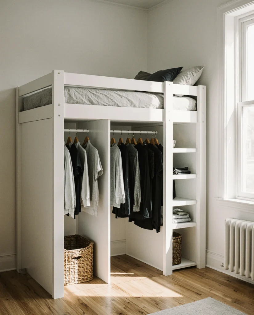 A loft bed with an incorporation of wardrobe is an all-in-one furniture item ideal for compact spaces where a closet and bed separately would take all of the floor area. These designs have hanging rods, shelves, and sometimes drawers built into the loft structure, essentially forming a vertical closet using the same footprint as the bed. This design is a perfect structure for studios, kits, and old houses with small closet spaces.