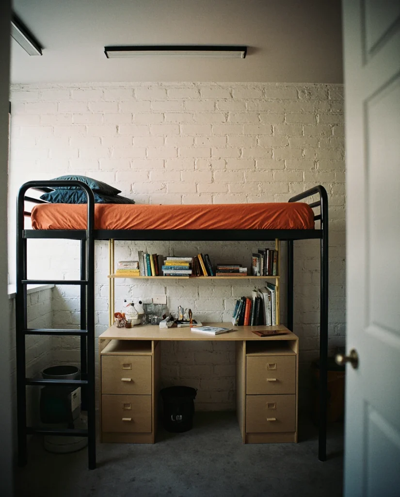 Standard dorm room loft beds have evolved beyond the basic institutional frames of previous decades, with many universities now offering modular systems that let students configure their dorm space for studying, sleeping, and socializing. These twin-sized setups typically include integrated desks, shelving units, and wardrobe components that lock together, creating an all-in-one furniture solution for 10×12 foot rooms. The underneath area becomes prime real estate for mini-fridges, seating, or additional storage that keeps the limited floor space functional.
