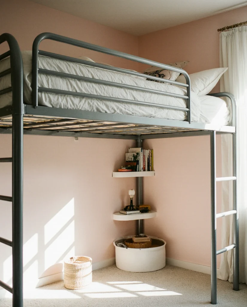 Real teenagers in suburbs from Atlanta to Seattle have embraced the “cozy corner” trend, where the space beneath the loft becomes a cushioned hangout area with throw pillows, a small rug, and maybe a beanbag chair—perfect for scrolling TikTok or chatting with friends. This works particularly well in homes where teens share bedrooms with siblings, as the elevated bed creates a sense of personal territory and the underneath area serves as a semi-private zone for activities that don’t involve sleep.