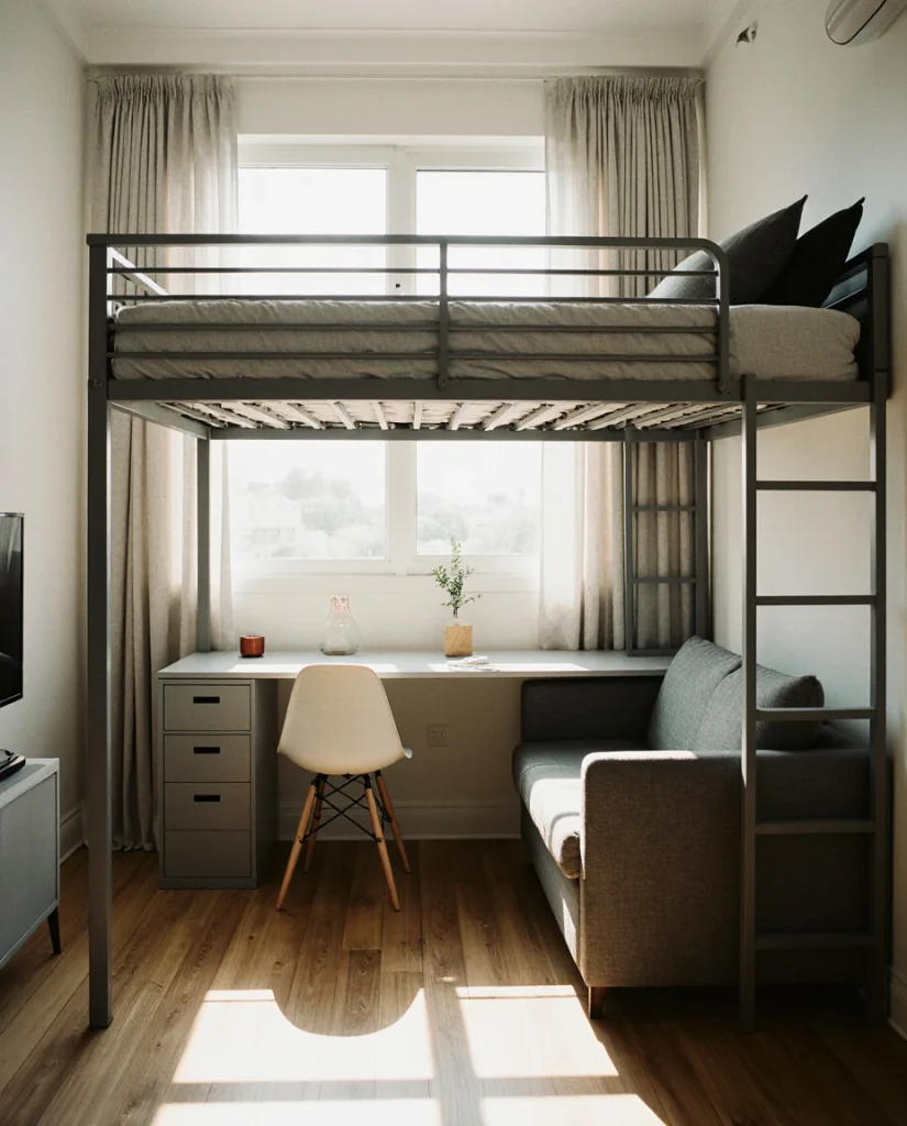 Creating an aesthetic loft bed environment in small rooms means treating the elevated sleeping area as a personal retreat rather than just a functional solution. This approach incorporates soft textiles, warm lighting, and carefully curated décor to make the loft feel cozy and intentional, not cramped. Think layered neutral bedding, a small reading lamp clipped to the frame, and perhaps a sheer canopy that adds privacy without blocking natural light—these details transform a basic loft bed into an Instagram-worthy sanctuary.