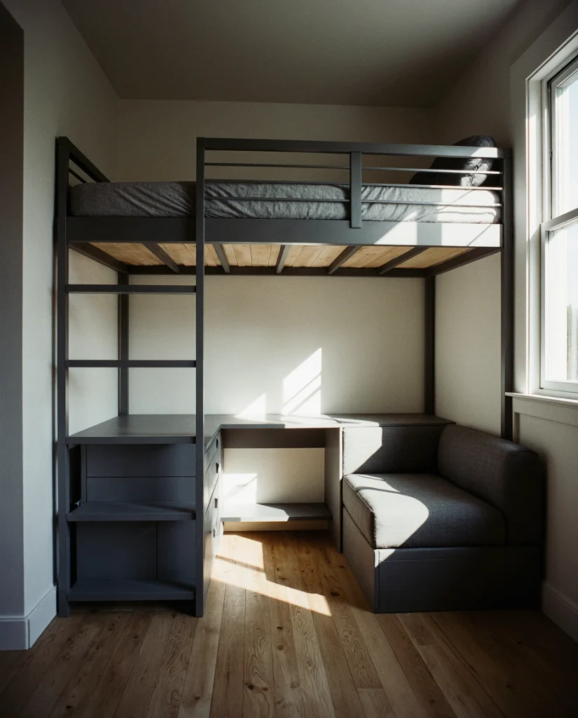 The ultimate small-room space-saving solution incorporates three or more functions into a single loft bed footprint—sleeping surface, desk, storage, and even seating or entertainment areas working together vertically. These sophisticated systems might include a Murphy desk that folds down from the loft frame, a sofa or futon underneath that converts to guest sleeping, and stairs with built-in drawers that eliminate the need for a separate dresser. This approach is particularly valuable in small rooms measuring under 100 square feet, where every piece of furniture must earn its place.