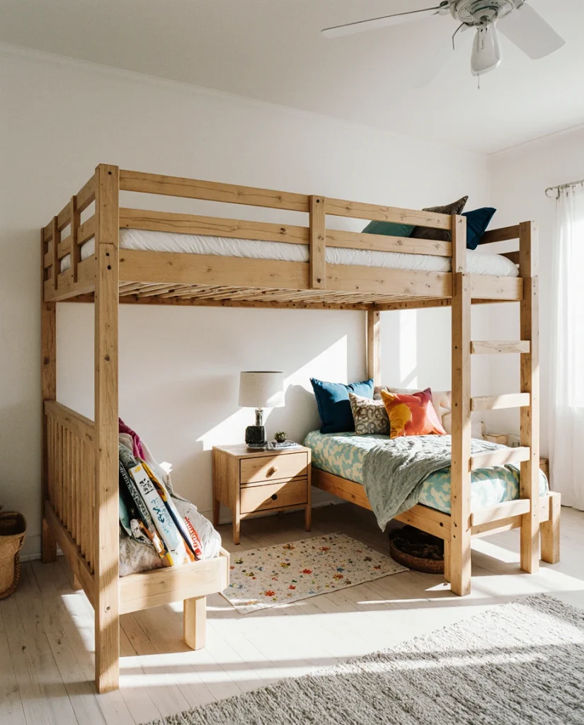 A double loft bed—essentially a bunk bed where both sleeping surfaces are elevated—maximizes vertical space in shared kids’ bedrooms while creating a surprisingly open floor plan below. These configurations work particularly well in narrow rooms where traditional side-by-side twin beds would eat up all usable floor space, leaving no room for play or storage. The perpendicular L-shaped arrangement is most common, with each bed meeting at a corner and supported by a shared central post.