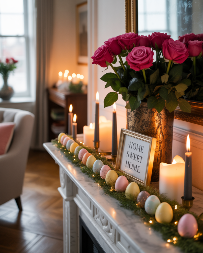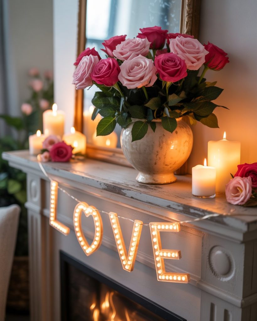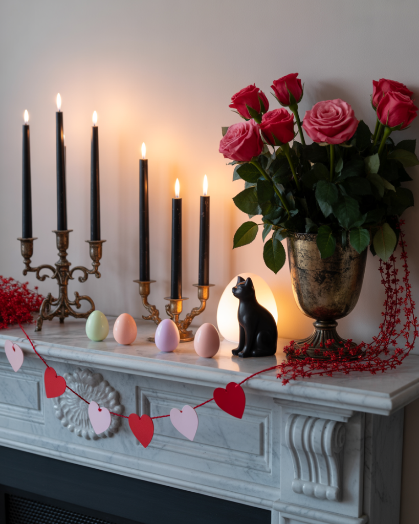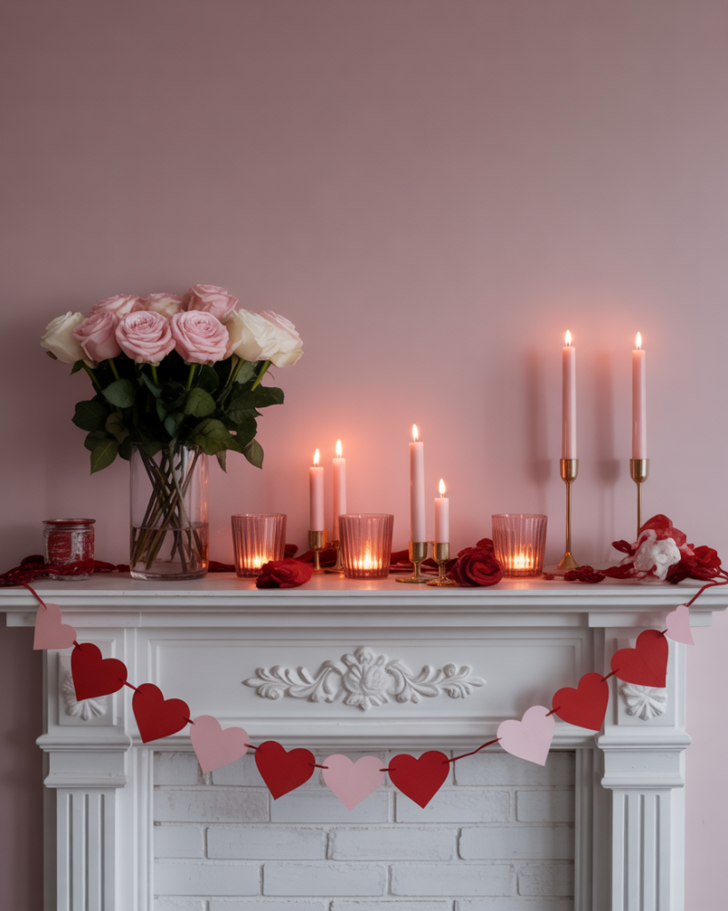 For valentine, bring soft romance to your mantle with roses, glass votives, and framed love notes. Red and blush tones shine against white or neutral walls. One year I added heart-shaped garland across my mantle, and it turned a cold February evening into a celebration of warmth.