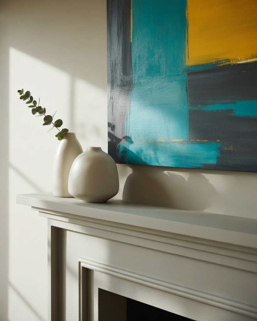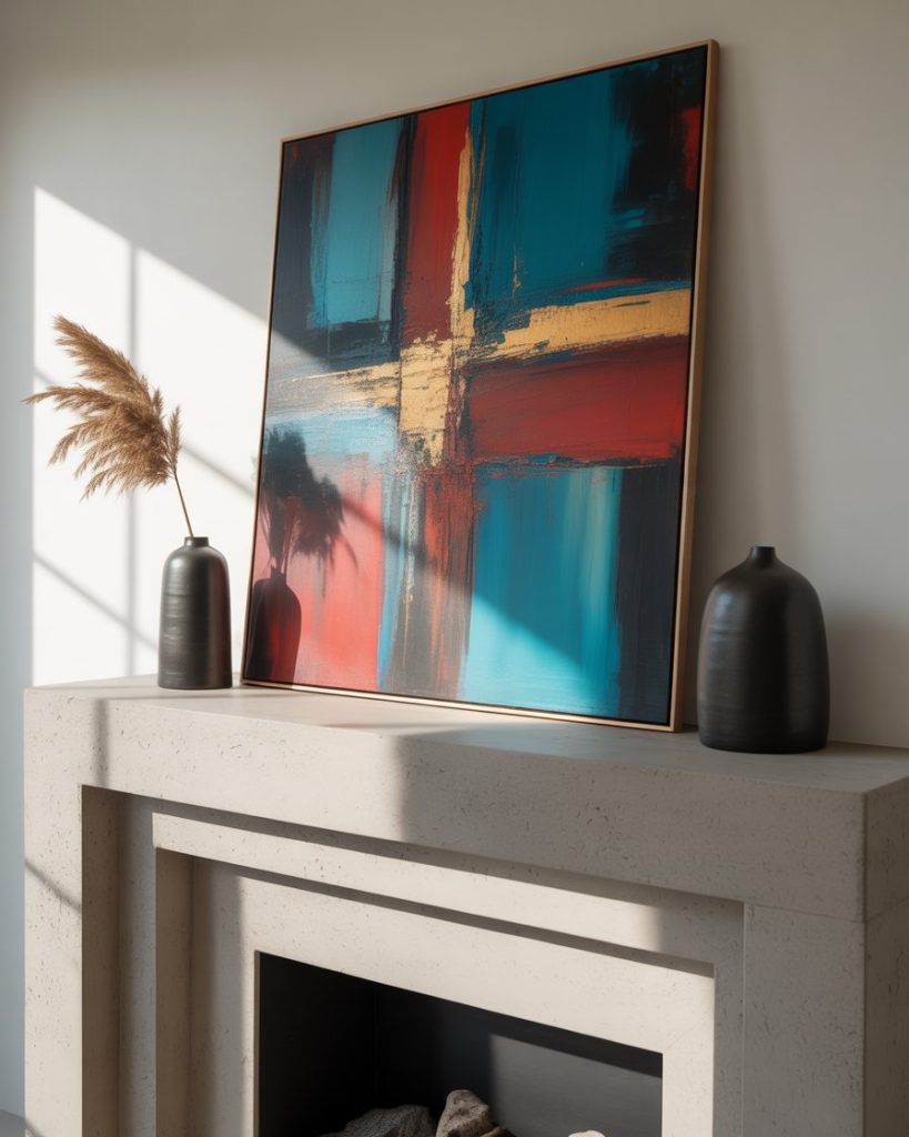 A contemporary mantle favors clean lines, uncluttered surfaces, and statement art. Instead of layering many small objects, choose one oversized piece hung over the fireplace and balance it with sleek vases or candles. This style is perfect for lofts or newly built homes where minimalism speaks louder than tradition. I once saw a friend use a single framed abstract print, and it set the tone for the entire living room.