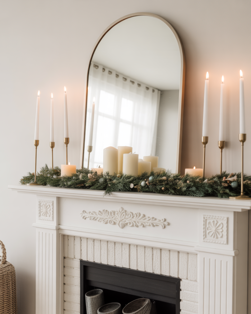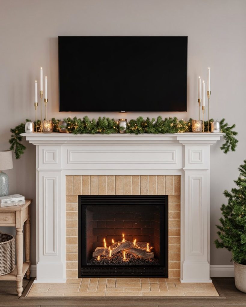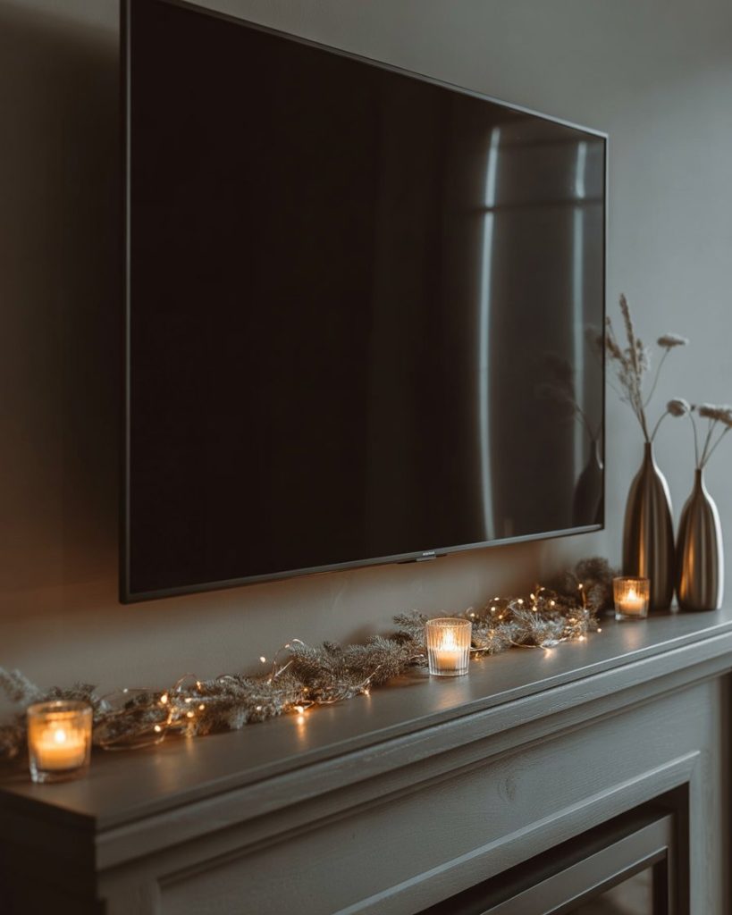 Many homes have a tv above the mantle, which can make styling tricky. To keep the focus balanced, use slim décor: narrow garland, small votives, or vertical accents that don’t block the screen. It’s about enhancing rather than competing with the television. Interior experts at Apartment Therapy often advise layering just below the screen.