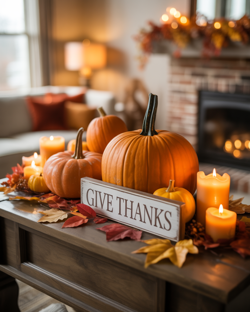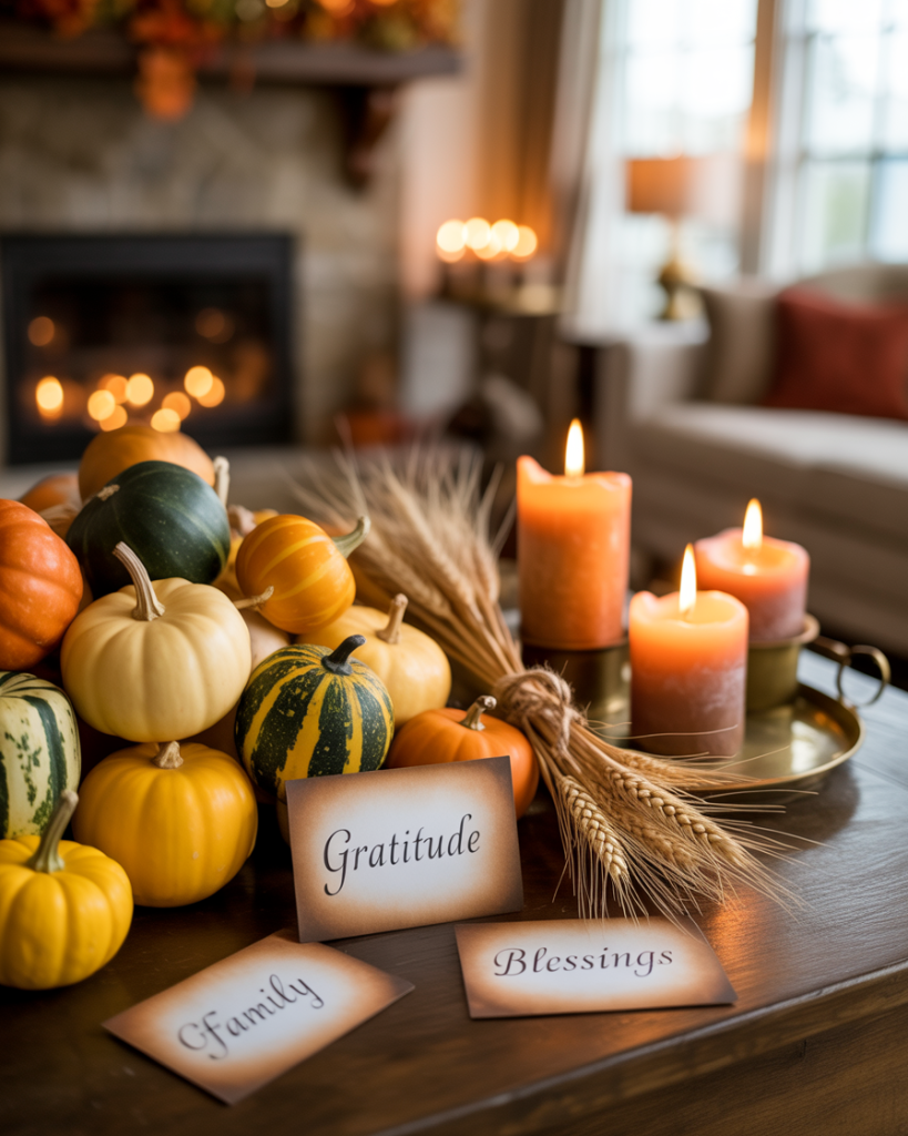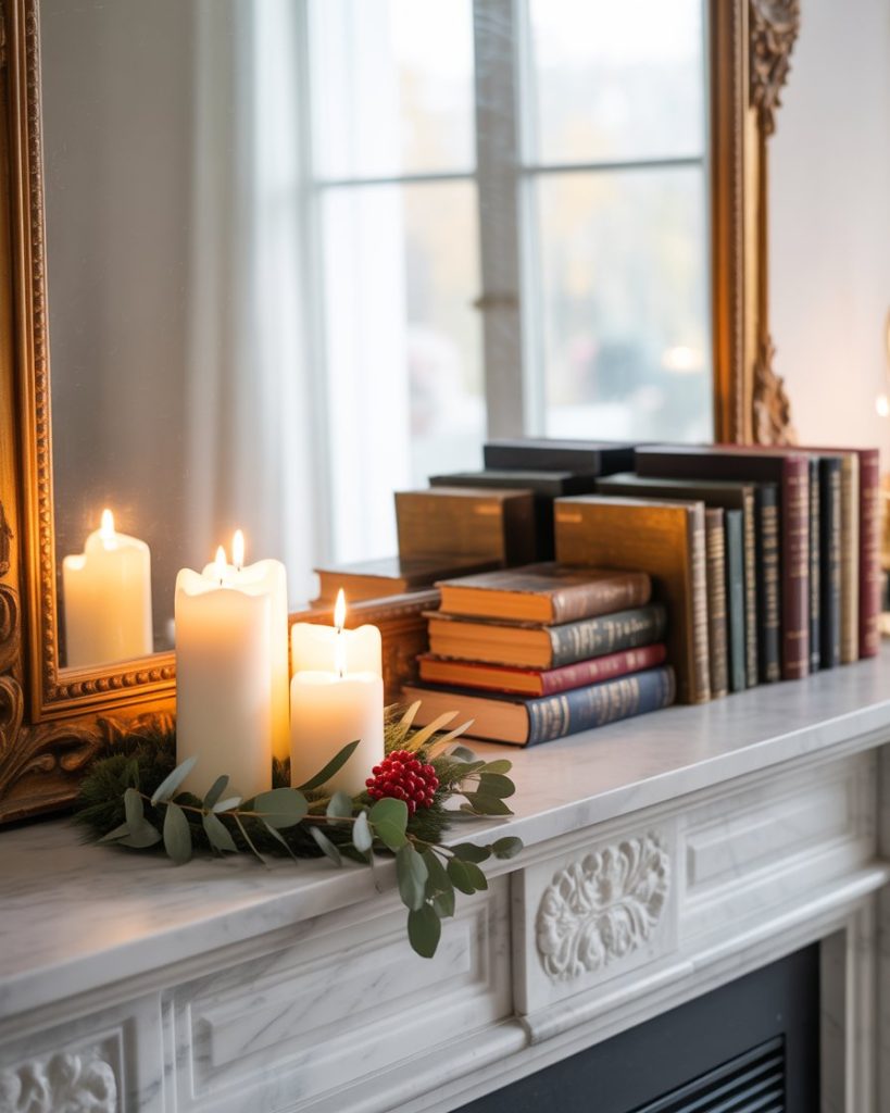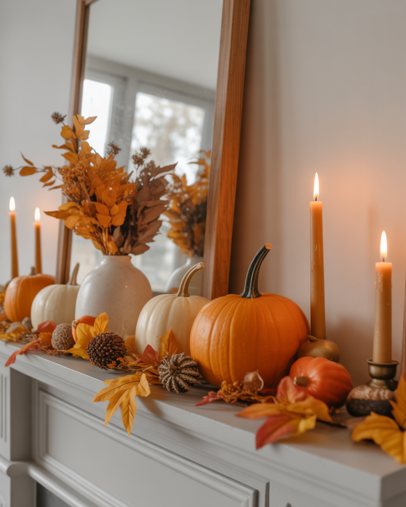 During thanksgiving, a mantle can reflect harvest bounty. Place gourds, wheat bundles, and clusters of amber-toned candles. Add handwritten gratitude notes tucked into the display for a personal touch. This style feels both festive and intimate, drawing family and friends closer together.
