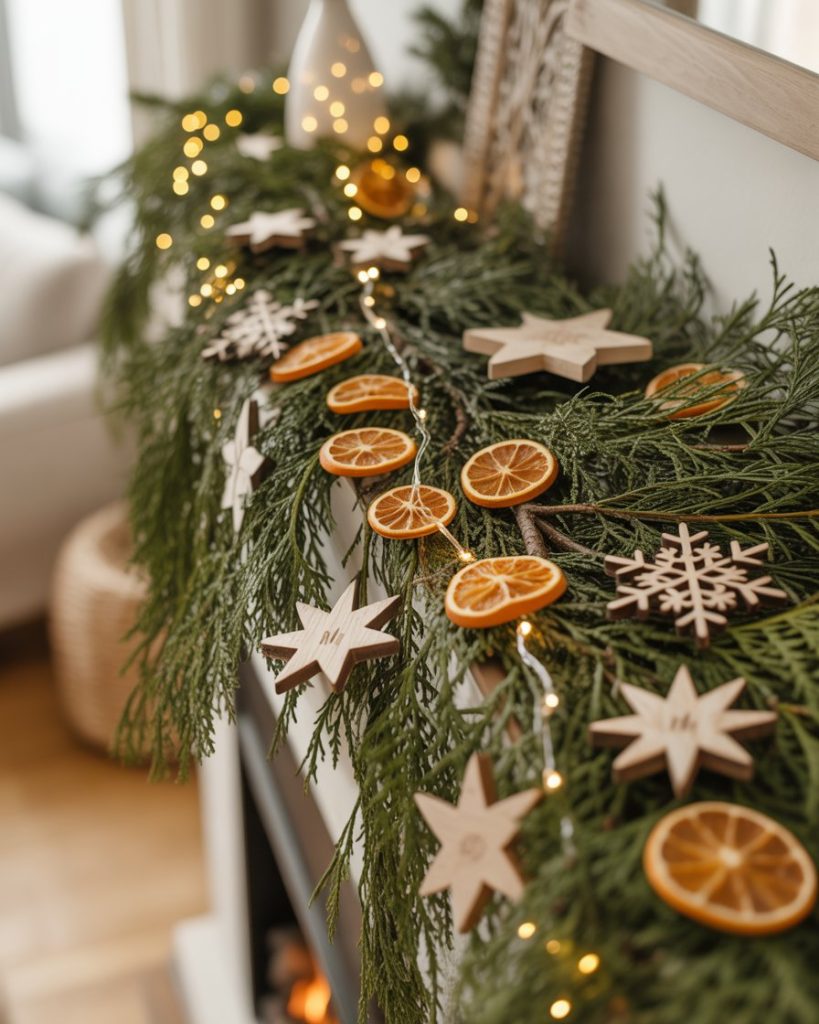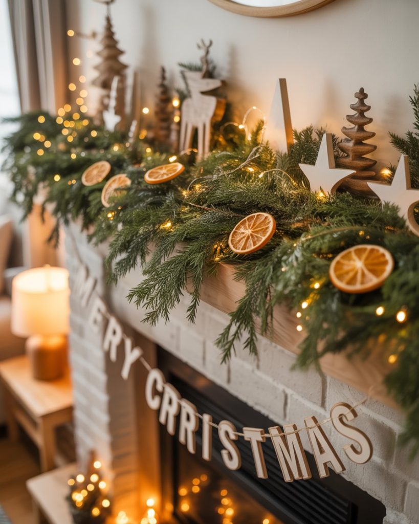 A natural christmas mantle emphasizes organic textures. Pine branches, wooden ornaments, and dried orange slices look beautiful paired with beeswax candles. This style feels effortless and eco-friendly, perfect for families who want holiday décor without too much glitz. Designers like Remodelista often showcase this as a sustainable holiday solution.