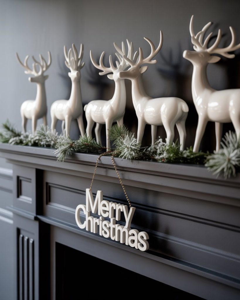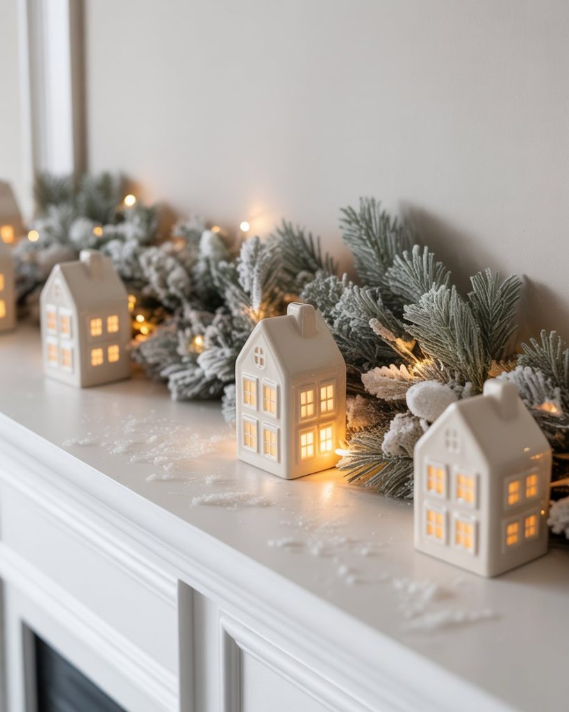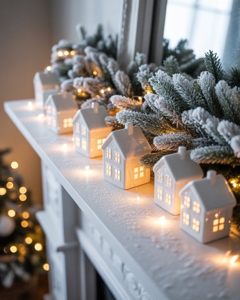 A white-themed mantle for winter creates serene calm. Layer frosted garland, ceramic houses, and snowy textures for a soft glow. This look works well for those who prefer a neutral christmas palette, where simplicity feels sophisticated. I once created a mantle like this in a city apartment—it instantly brightened the whole room in gloomy January.