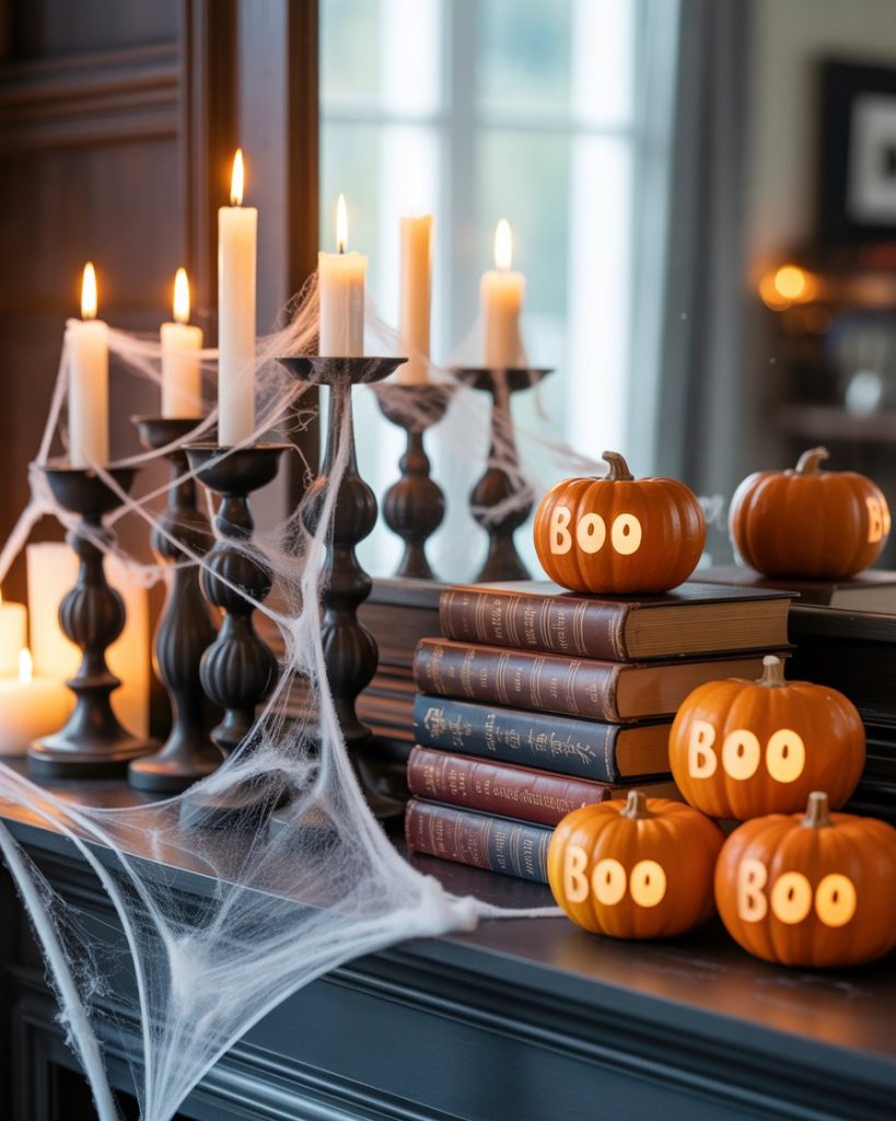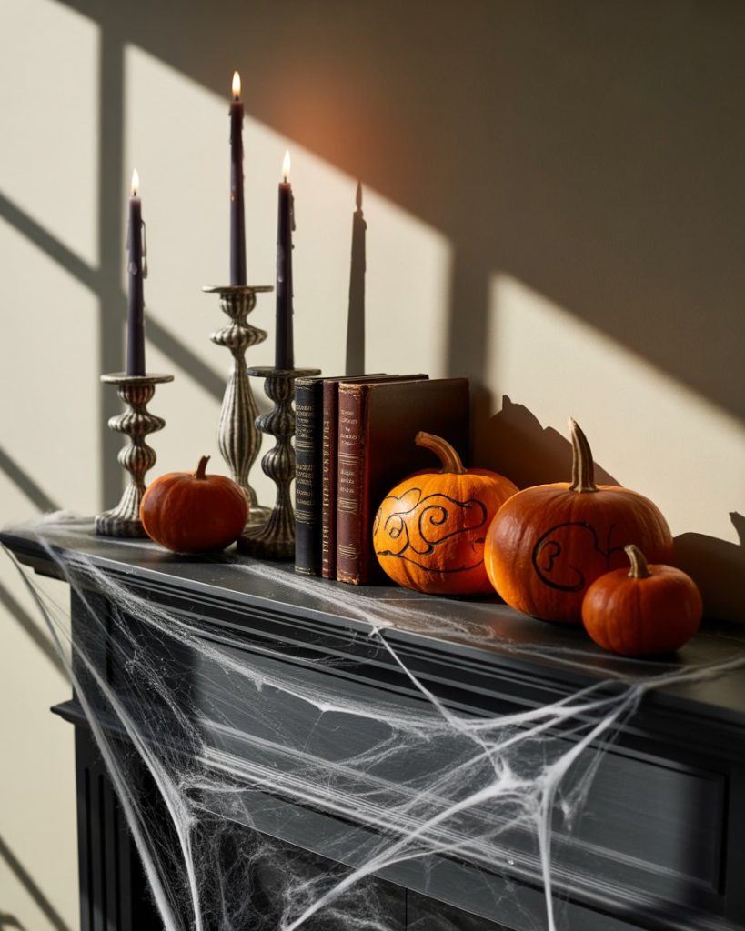A halloween mantle thrives on drama. Use black candlesticks, faux spider webs, and vintage books stacked under eerie figurines. Add a touch of orange with mini pumpkins to keep the balance playful. I once styled mine with a crow perched on the edge, and it became the star of our neighborhood party.
