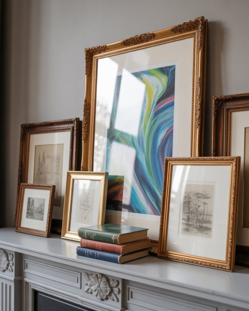 For an elegant but contemporary approach, layer framed art pieces in different sizes across the mantle instead of hanging one big piece. Mix modern prints with traditional sketches for a dynamic, collected feel. Designers like Nate Berkus love this “curated gallery” mantle look.