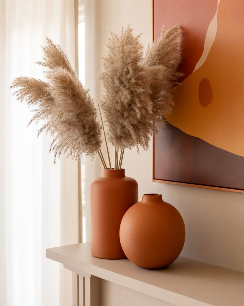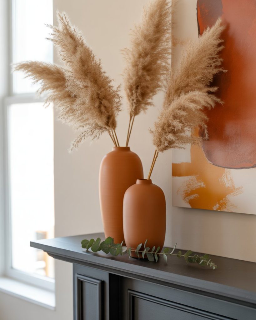 For a twist, a modern fall mantle avoids the usual orange and instead leans on muted tones—terracotta vases, abstract art, and dried pampas grass. This streamlined look keeps the space stylish well beyond the season. Designers like Studio McGee often pair it with white walls to make textures pop.
