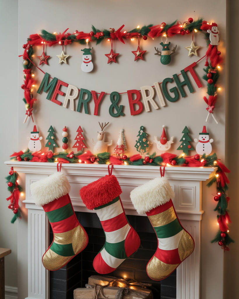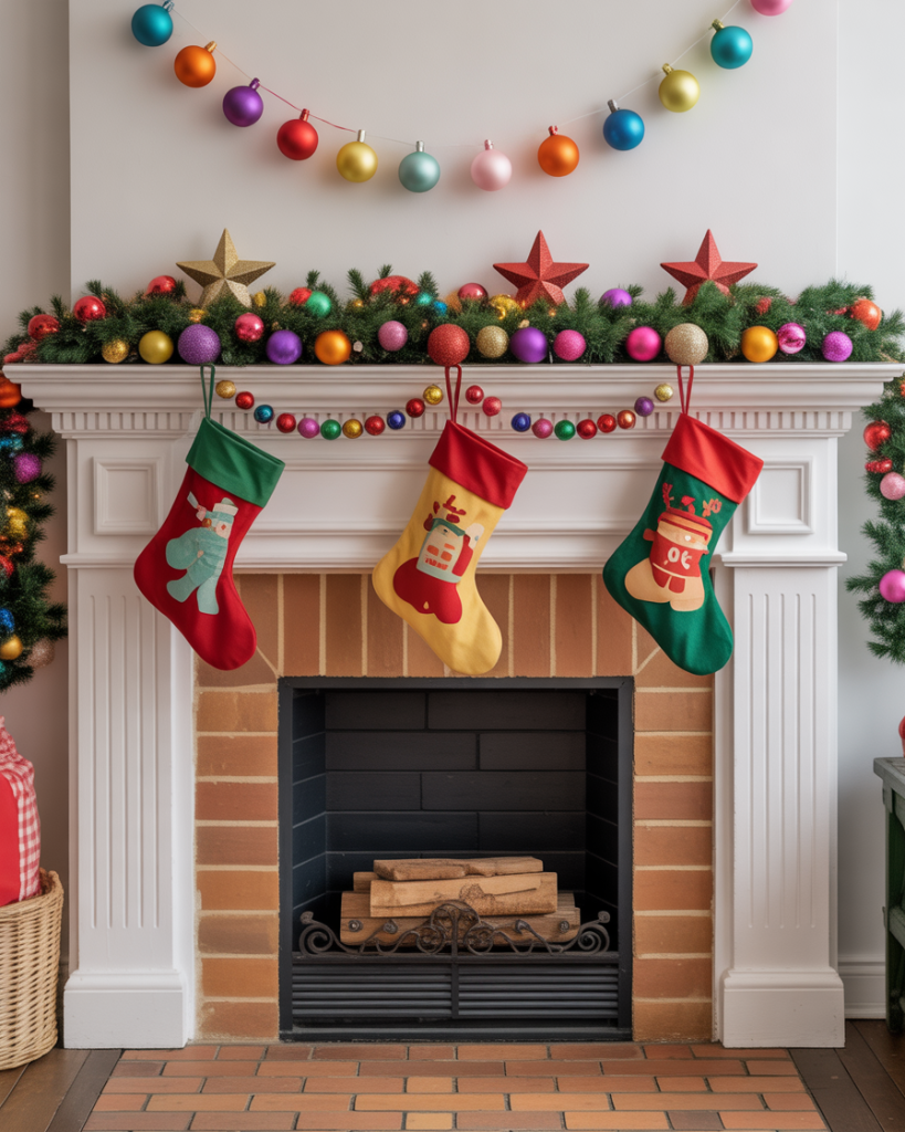 If subtlety isn’t your thing, embrace a colorful christmas mantle. Bright ornaments strung across, multi-hued stockings, and playful garlands bring joy, especially to homes with kids. It’s cheerful, casual, and instantly lifts the mood. I once saw a mantle like this paired with a tv overhead—it turned the whole wall into a lively stage.