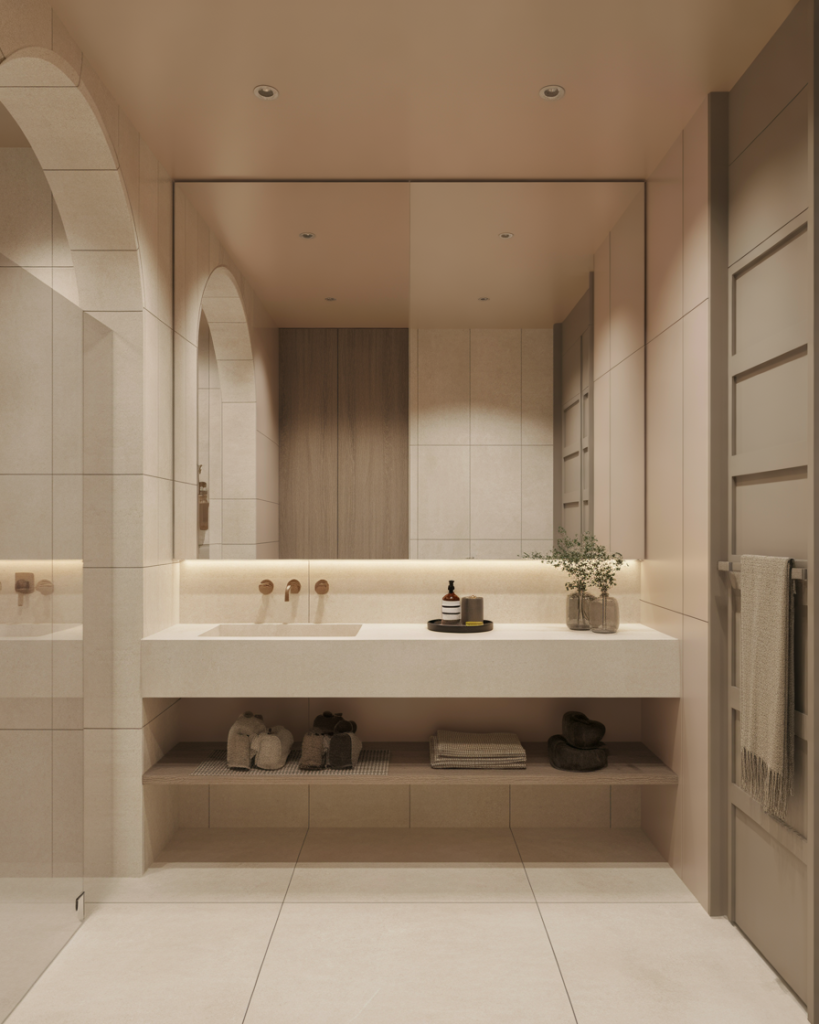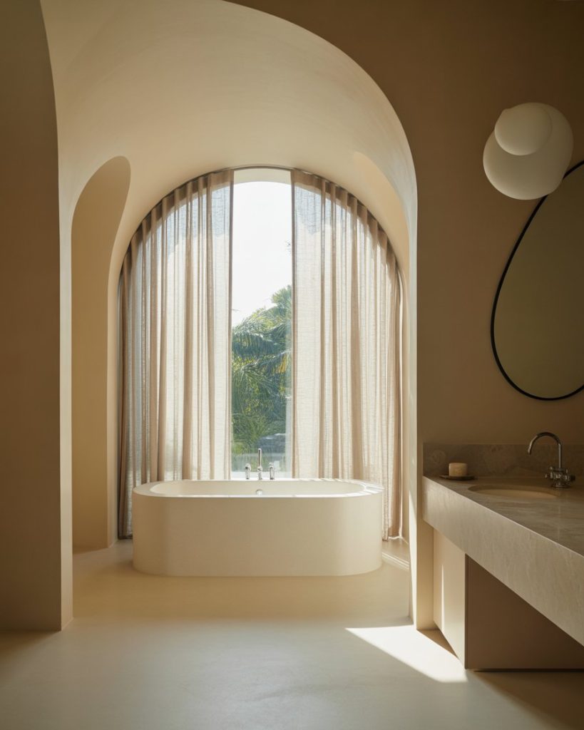In 2026, curved walls, rounded mirrors, and archways give bathrooms a soft, sculptural look. These modern shapes feel especially calming in a primary bath, though they also elevate a guest or tiny space. Paired with neutral palettes, curves create flow and make rooms feel less rigid. Designers like Patricia Urquiola highlight that curves invite warmth where sharp corners once dominated.