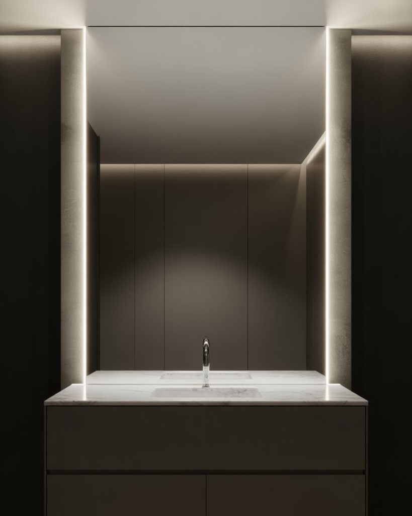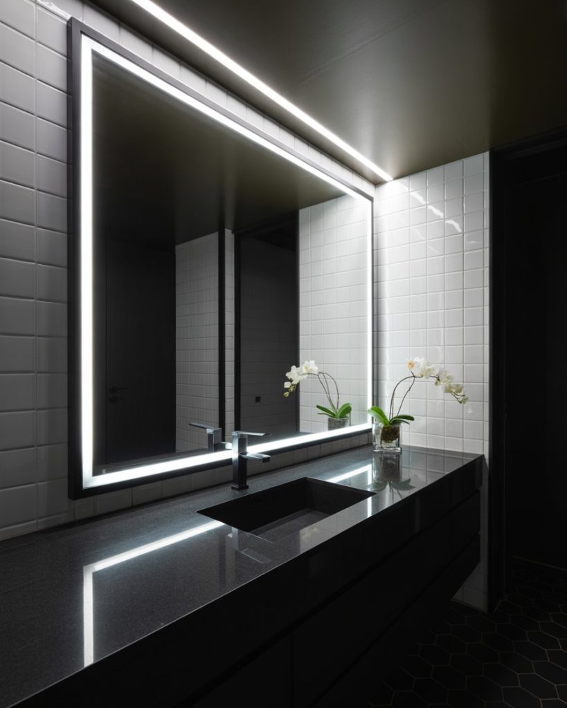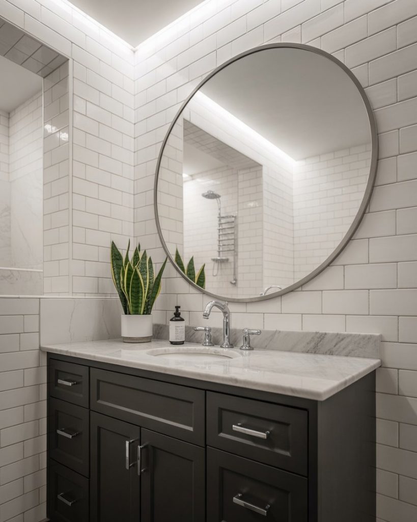 Creative lighting defines 2026 bathrooms, from LED strips beneath vanities to glowing mirrors. This works beautifully in dark bathrooms, making them inviting, or in black and white spaces to emphasize contrast. Even small half baths feel more expansive when layered lighting is used. I once visited a guest bath with hidden ceiling lights, and it felt cinematic.