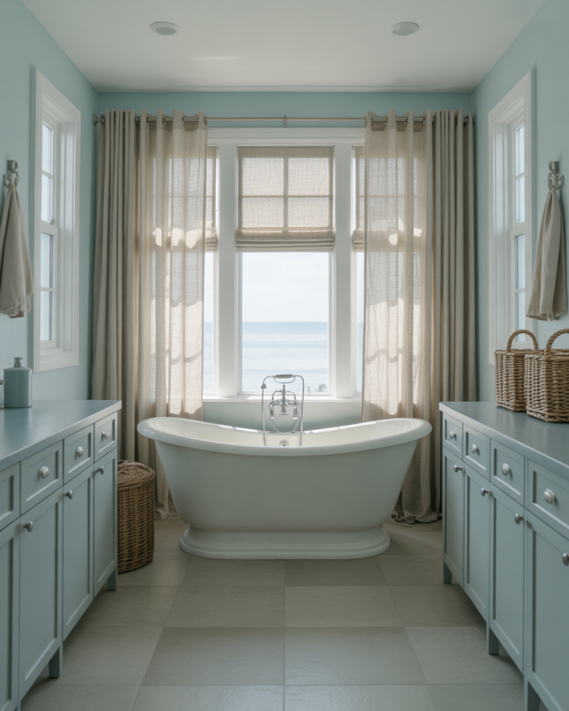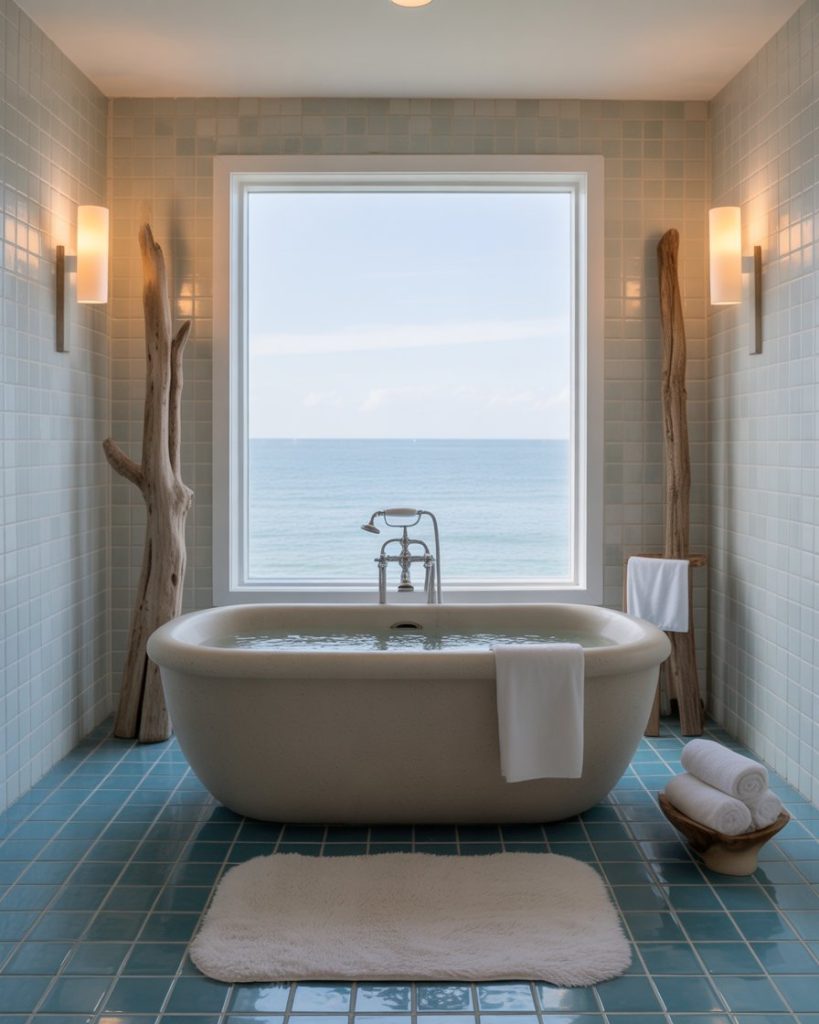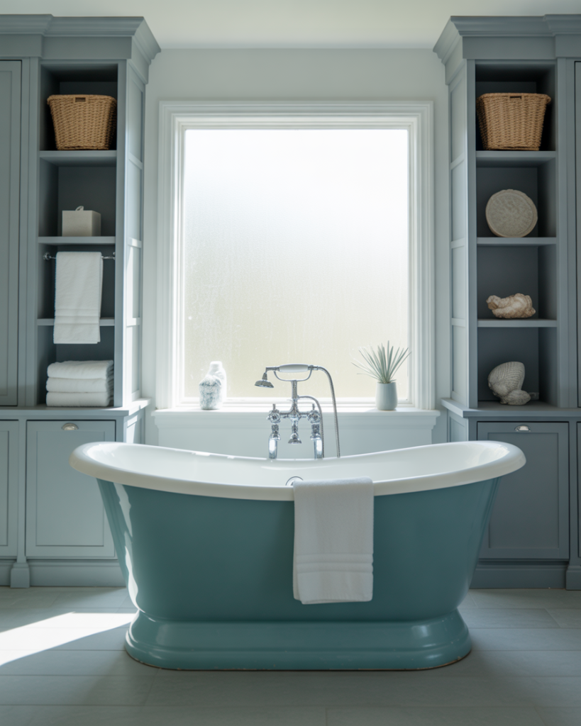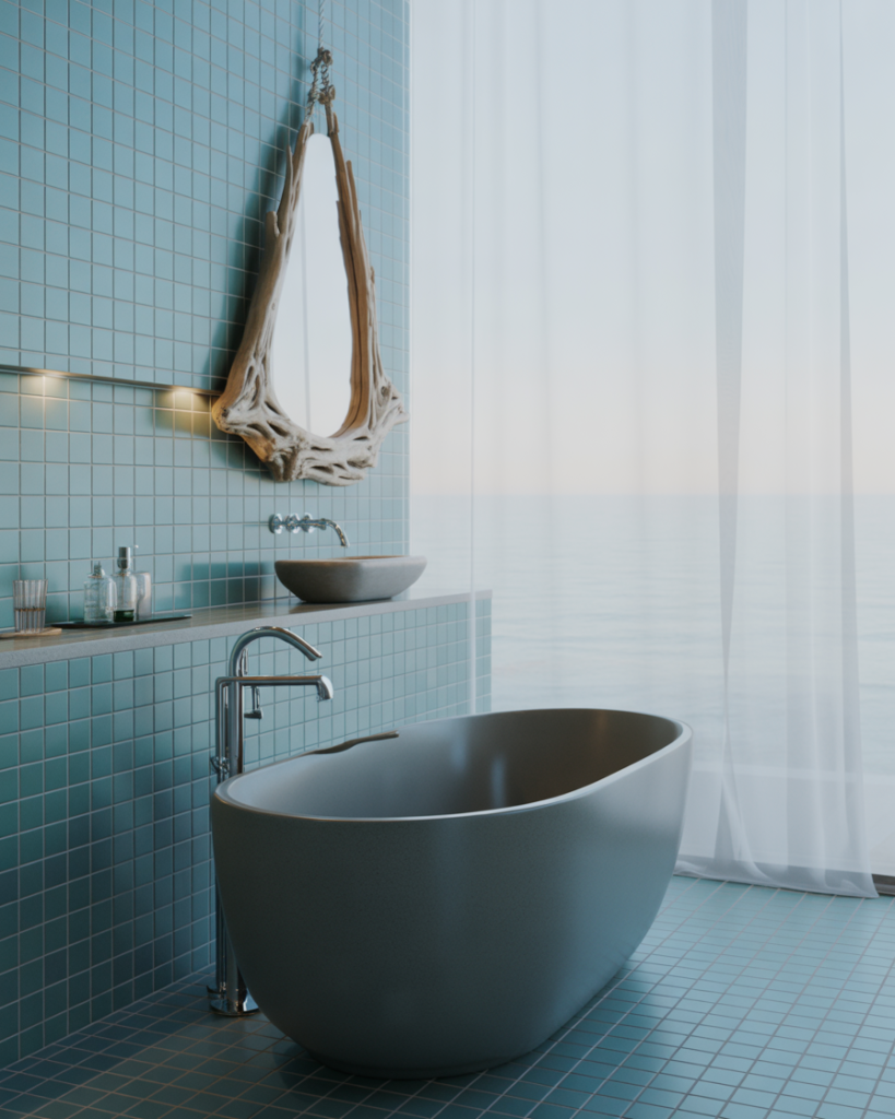 Pairing blue with grey creates a breezy coastal atmosphere, perfect for guest or ensuite baths. Think striped tiles, driftwood decor, and white walls that evoke seaside calm. I’ve seen this done in compact tiny spaces, and it instantly transports you to a vacation mood. Designers often suggest subtle nautical accents for balance, avoiding anything too literal.