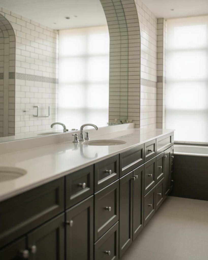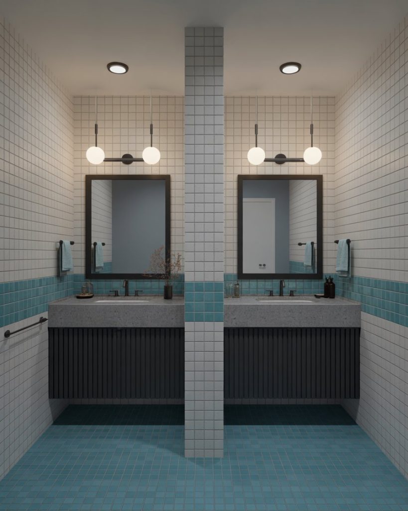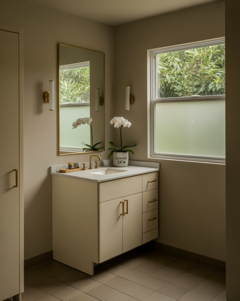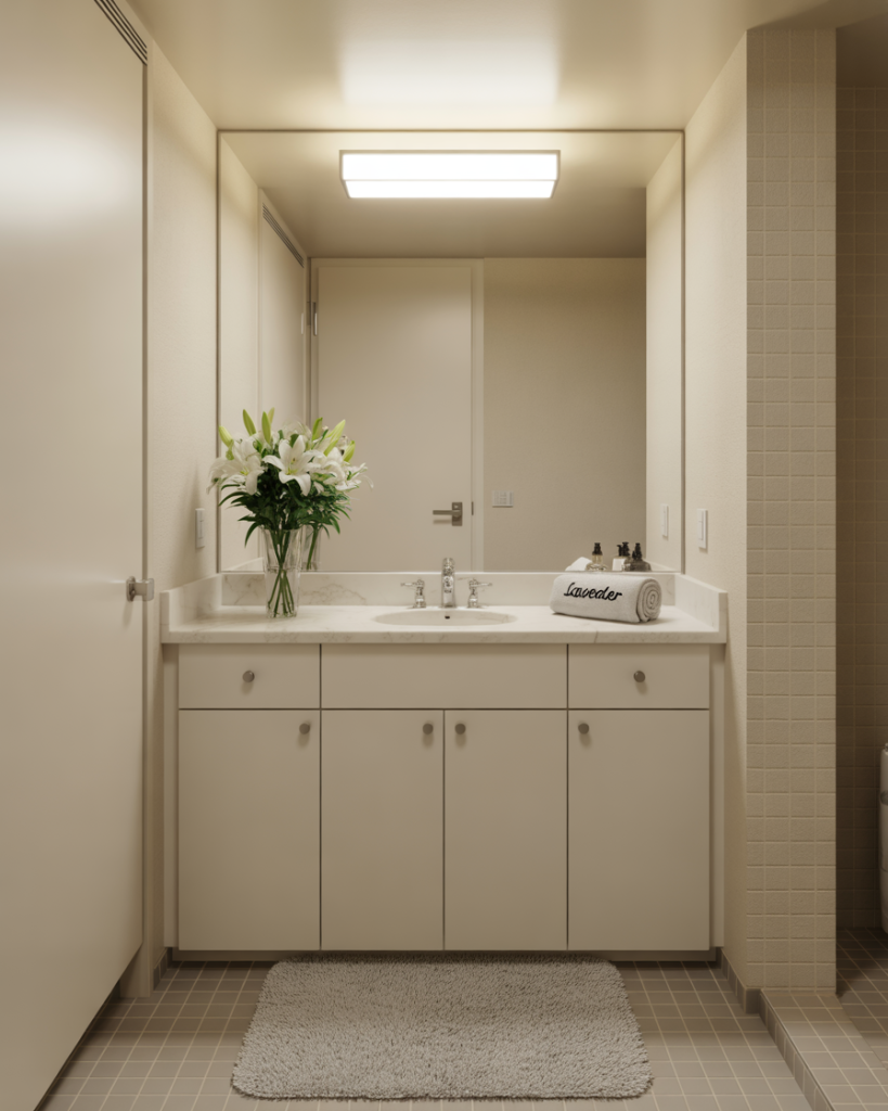 For younger homeowners, dorm-inspired bathrooms bring back minimal layouts with durable finishes. Think compact white vanities, neutral walls, and cute pops of decor for personality. This idea is perfect for a tiny or small full bath where every inch matters. Designers often recommend this style as affordable yet stylish, echoing simplicity with a touch of nostalgia.