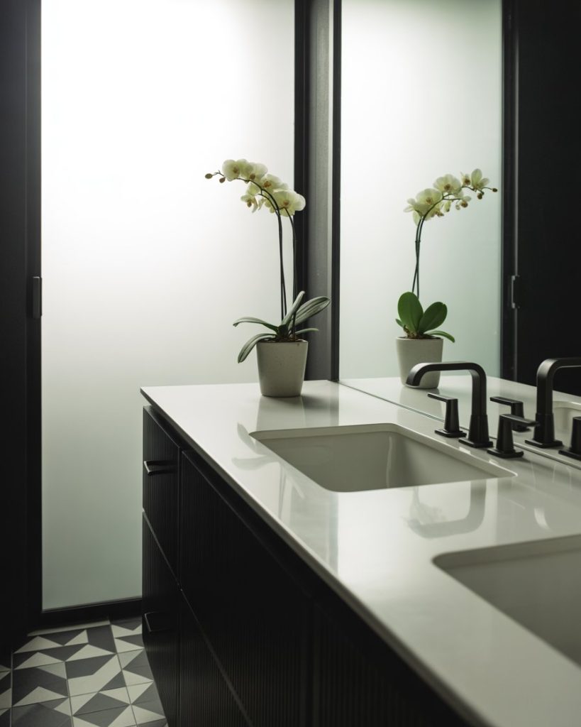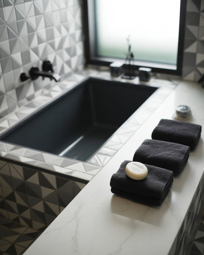 The black and white bathroom trend remains timeless but feels fresh in 2026 with bold geometric tiles and matte black fixtures. White quartz countertops and framed mirrors add crisp sophistication. Even a tiny or small half bath becomes striking with this palette. Designer Emily Henderson often points out that contrast is one of the easiest ways to elevate even the simplest bathroom.