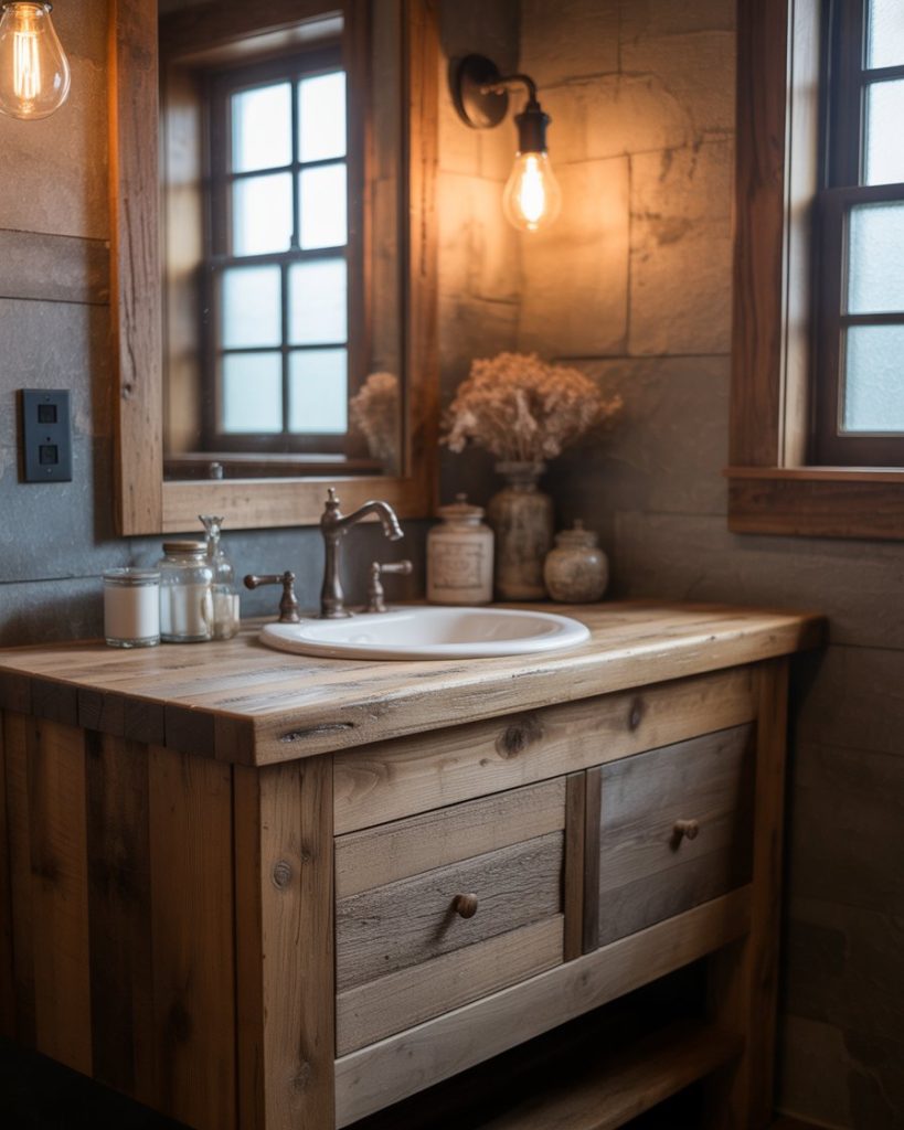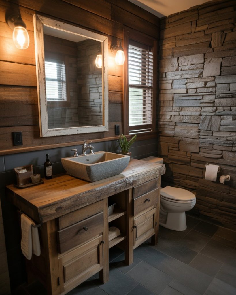 The rustic trend blends reclaimed wood with grey stone and vintage hardware. This look feels cozy in dark farmhouses or even tiny small half baths, where natural materials add character. Joanna Gaines reminds us that rustic design isn’t about clutter but about texture and balance. With the right decor, a rustic master bath can feel both grounded and luxurious.